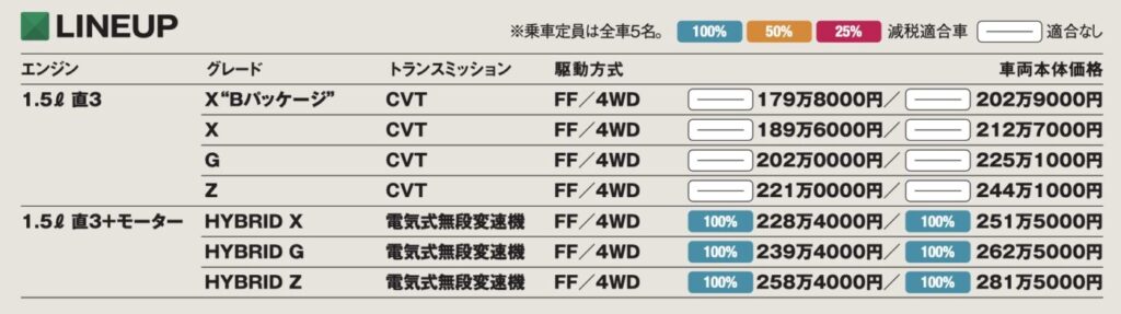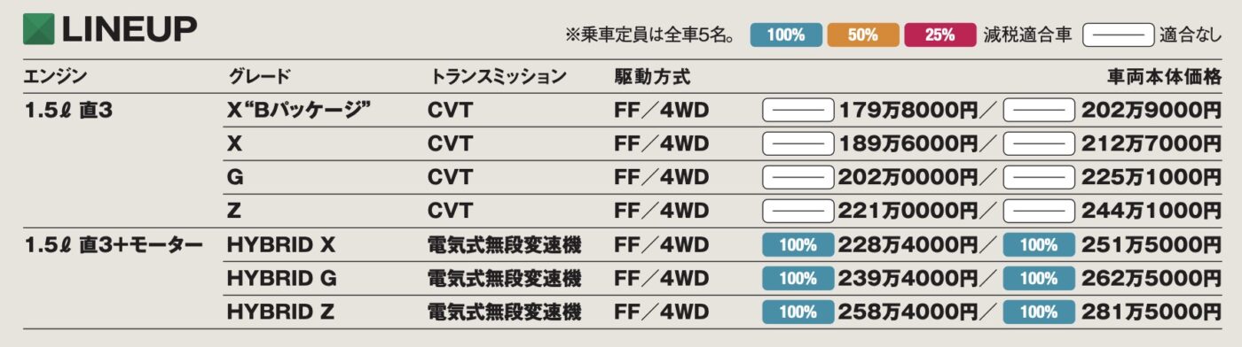 パワーユニットは1.5l直列3気筒ガソリンエンジンと、それをアトキンソンサイクル化してTHS-IIと組み合わせたハイブリッドシステムの2種類を用意。どちらのパワーユニットにもFFと4WDが設定されており、前者は電子制御多板クラッチ式、後者は後輪を電気モーターで駆動するE-Fourシステムを採用している。