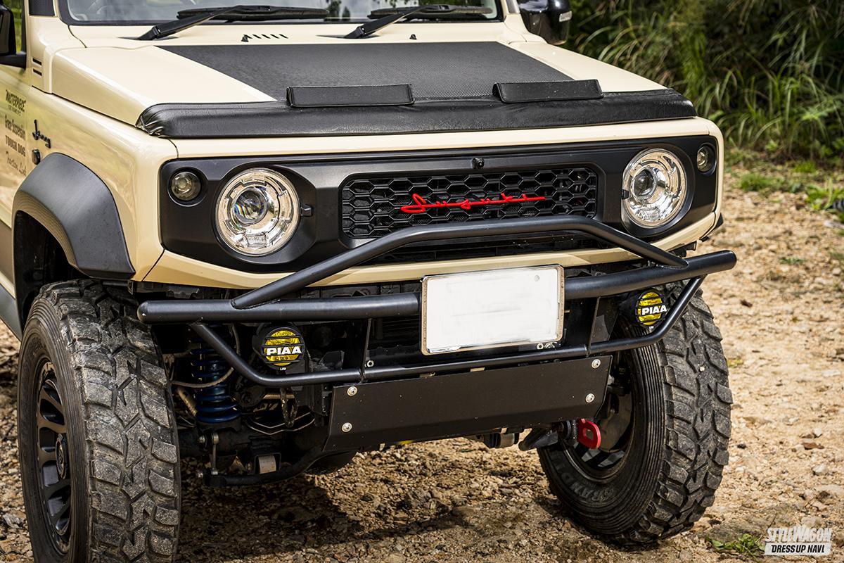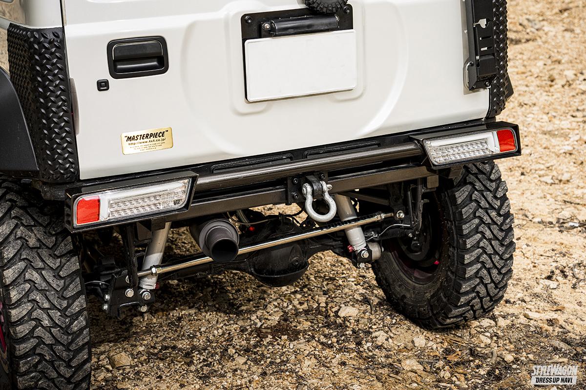 64は3インチアップキットに195R16タイヤの組み合わせ。スチールバンパーは車幅、前後出幅共に軽規格に収まる仕様なので車検もOK。ガードバーは下側に付属しフォグブラケット付き。スキッドプレートも付属するがステンレス仕様はオプション。リアは1本バータイプで、純正テール対応となっている。