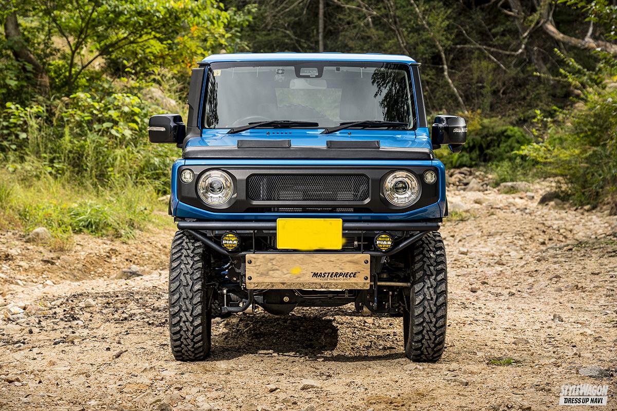 これまでジムニーといえば、ゴツゴツした岩場や荒れたオフロードを走るクロカン四駆のイメージが強かった。だが現行のJB64&74になって、ノーマル車高での街乗りオンリーや、チョイ上げキャンプ仕様など、今までのジムニーでは考えられないカスタム&スタイルが広まっている。とはいえ、やはりジムニー、ボディリフトしてオフロードタイヤというスタイルは、本来のクロカン四駆をイメージさせる外せないド定番スタイルといえる。そんな上げ&オフタイヤというスタイルに、切っても切れないのがスチールパイプ製のバンパーだろう。もともとはゴツく外径の大きいオフタイヤとの干渉や岩などとのヒットを避けるために考えられたバンパーだが、その力強くワイルドなルックスからオフ走行派でなくても装着する人が増えている。ここでピックアップするのは、足回りから、チューニング、内外装まで、ジムニーを丸ごとカスタムできることでジムニー乗りにはおなじみのマスターピースのアイテム。ブルーのジムニーに装着された64用とベージュシエラに装着された74用とがあり、違いは左右幅と前後出幅。64用は左右超、前後出幅共に軽規格サイズに収まるデザインとなっていて車検も問題なし。64用は下側のみガードバーが付いていて、74用は上下にガードバーが付いているが、このあたりのデザイン違いは相談すれば融通がきくのがマスターピースの良さ。白ボディの74のように完全オーダーメイドにも対応してもらえるので、自分好みのスチールバンパーを作ることも可能。自分だけのスチールバンパーが欲しいという方はマスターピースに相談してみよう。