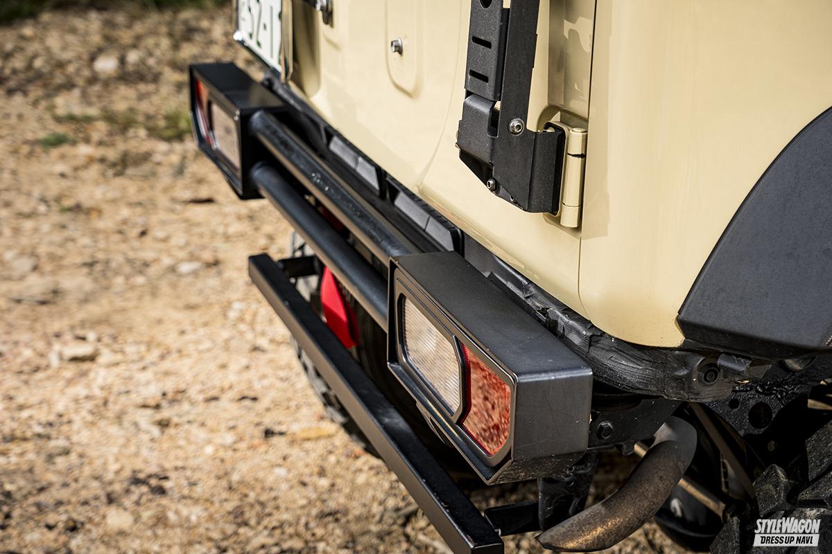 74シエラ用スチールバンパーは、64用に比べ左右幅も前後の出幅も長くなっているのが特徴。フロントは上下にガードバーが付き(スキッドプレートも付属)、リアはダブルチューブ仕様となっている(純正テール対応)。このあたりのデザイン違いは、希望すれば64用でも作ってもらえるのがマスターピースというショップだ。
