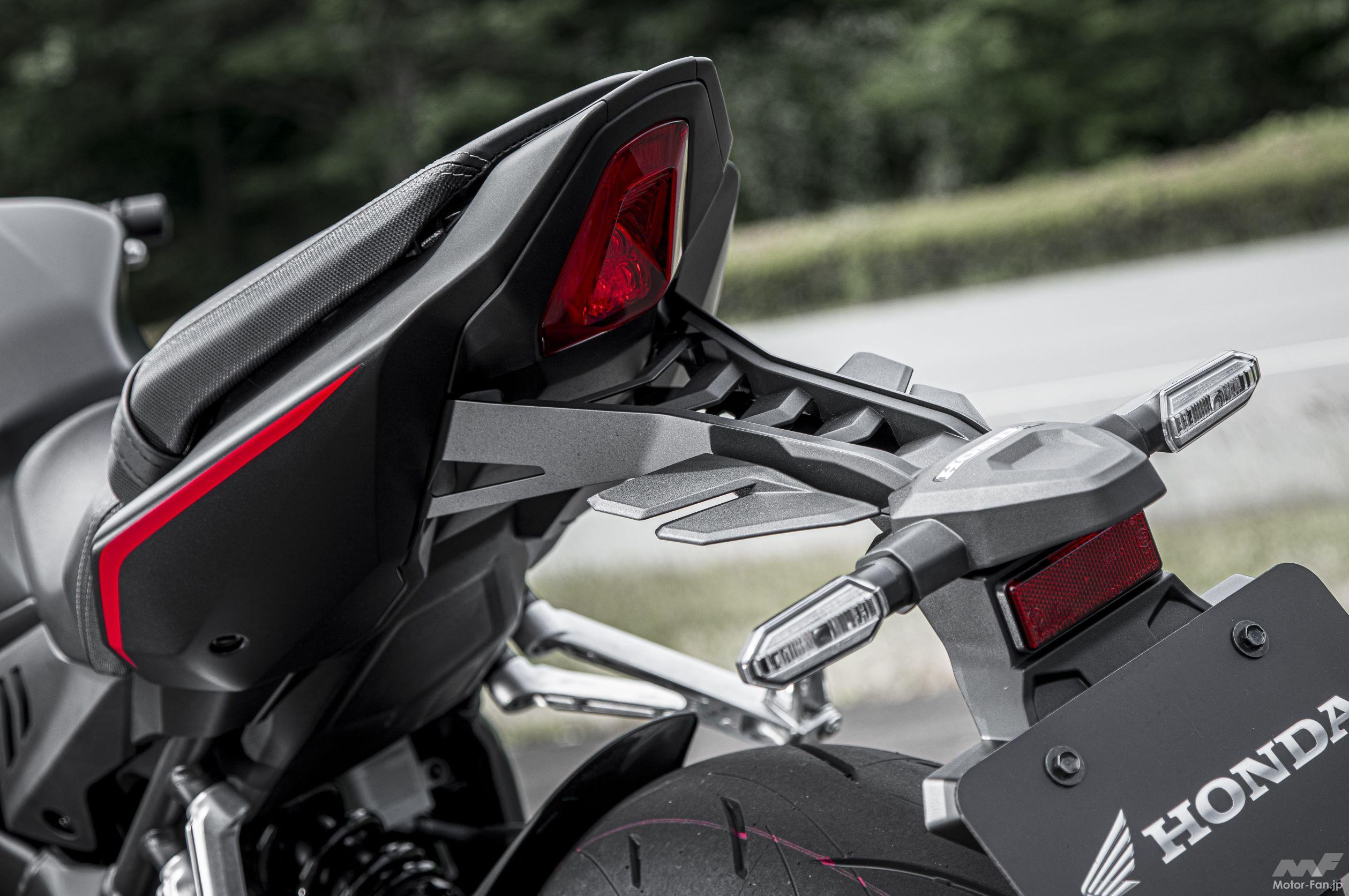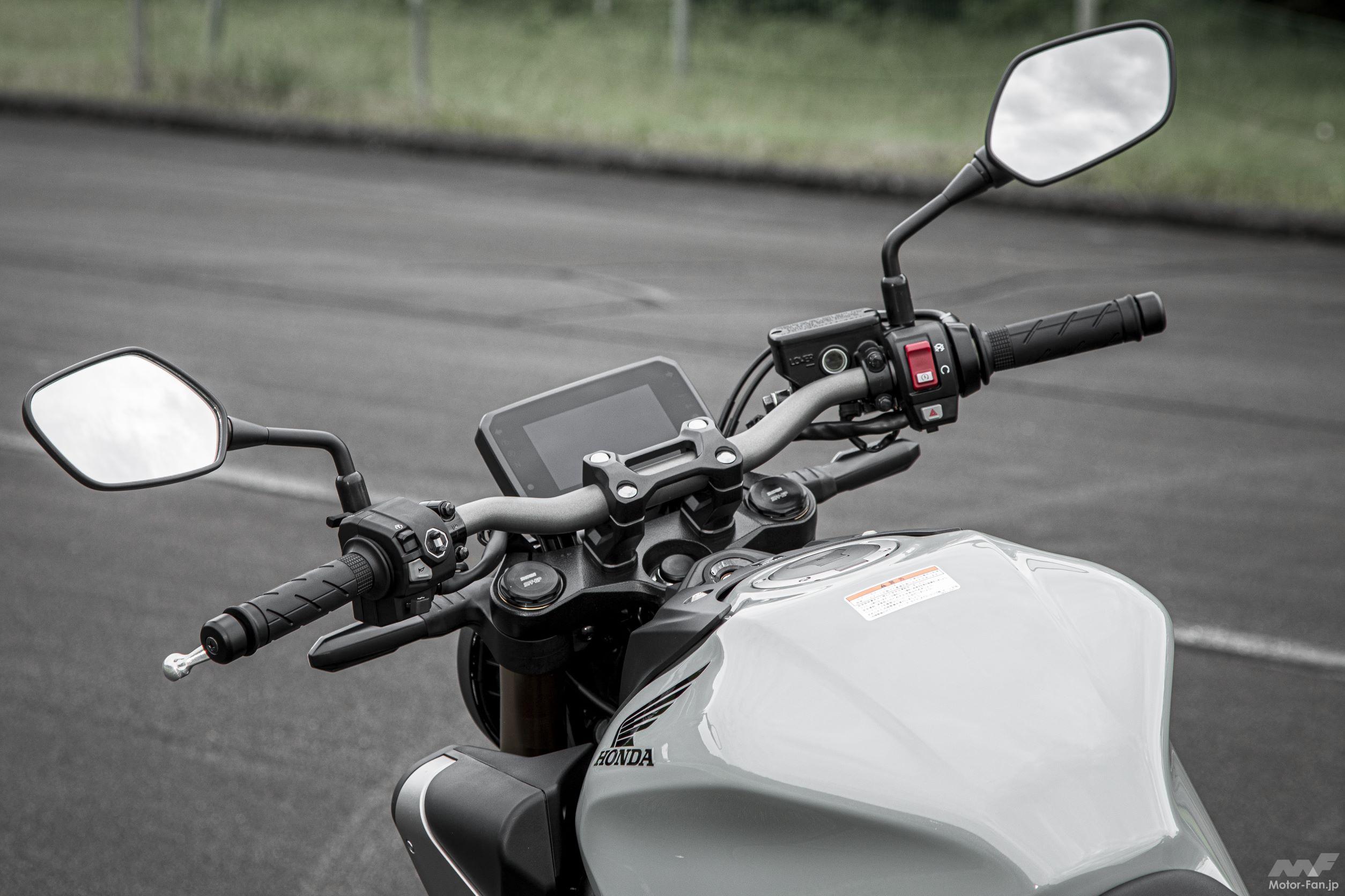 これに対してネイキッドのCB650Rは、とにかくロール方向の動きが軽快で、CBR650Rに対して10kg以上は軽いようなイメージだ。ライディングポジションはアップライトで、なおかつハンドルバーの幅が広く、積極的にマシンをコントロールできる。また、カウリングがない分だけ車体のピッチングが分かりやすく、これも扱いやすさの源になっている。二次旋回の印象はCBR650Rと大差ないが、そこに至るまでの倒し込みが素早く、また車体姿勢をコントロールしやすい分だけ、ネイキッドのCB650Rの方がワインディングロードは楽しいと言えるだろう。