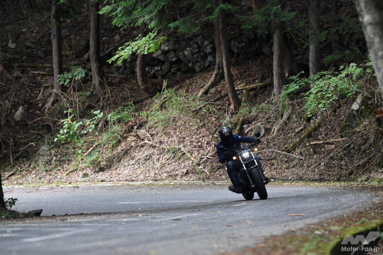続いては峠道の話。まずは大前提をしておくと、ボバーテイストな見た目とは裏腹に、レブル3兄弟はコーナリングが楽しいスポーツバイクである。この件については1100のインプレでも記したのだが、500と250も長兄と同様に、必要にして十分な車体剛性や絶妙のライポジ、トレールの最適化を図るスランテッドアングル、意外に深いバンク角などのおかげで、既存のクルーザーとは一線を画するスポーツライディングが満喫できる。