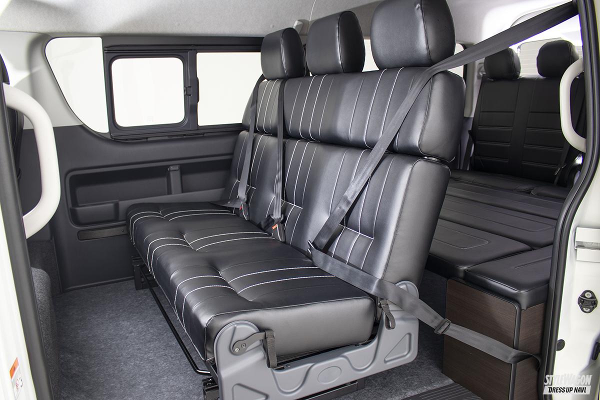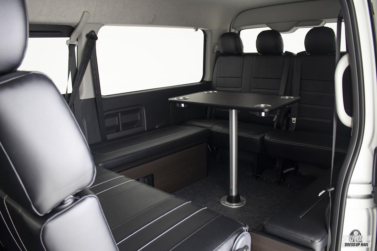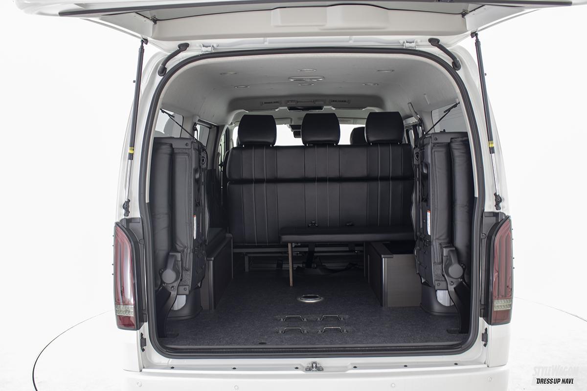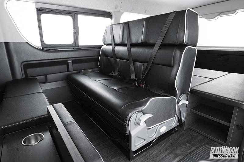 200系ハイエースはセカンドシートから後ろの空間を自在にアレンジできるシートが多数リリースされている。この度、フレックスから仲間入りした「アクロス」は、フルフラット時に超広々としたベッドスペースを実現できるのが最大の特徴。それを可能にしているのが、1.5列目に採用しているFASPシートだ。展開することでフラットになり、セカンドシートを倒すことで地続きになる仕組みで、テーブルを取り付ければお座敷的に使うことも可能。充電用USBソケットやシューズボックスも標準装備。広大な空間で、ごろ寝しながらくつろげる、最高のぜいたくを味わおう!