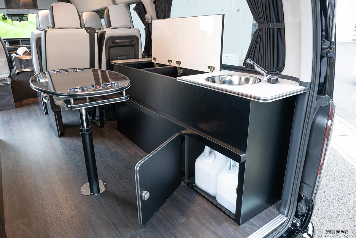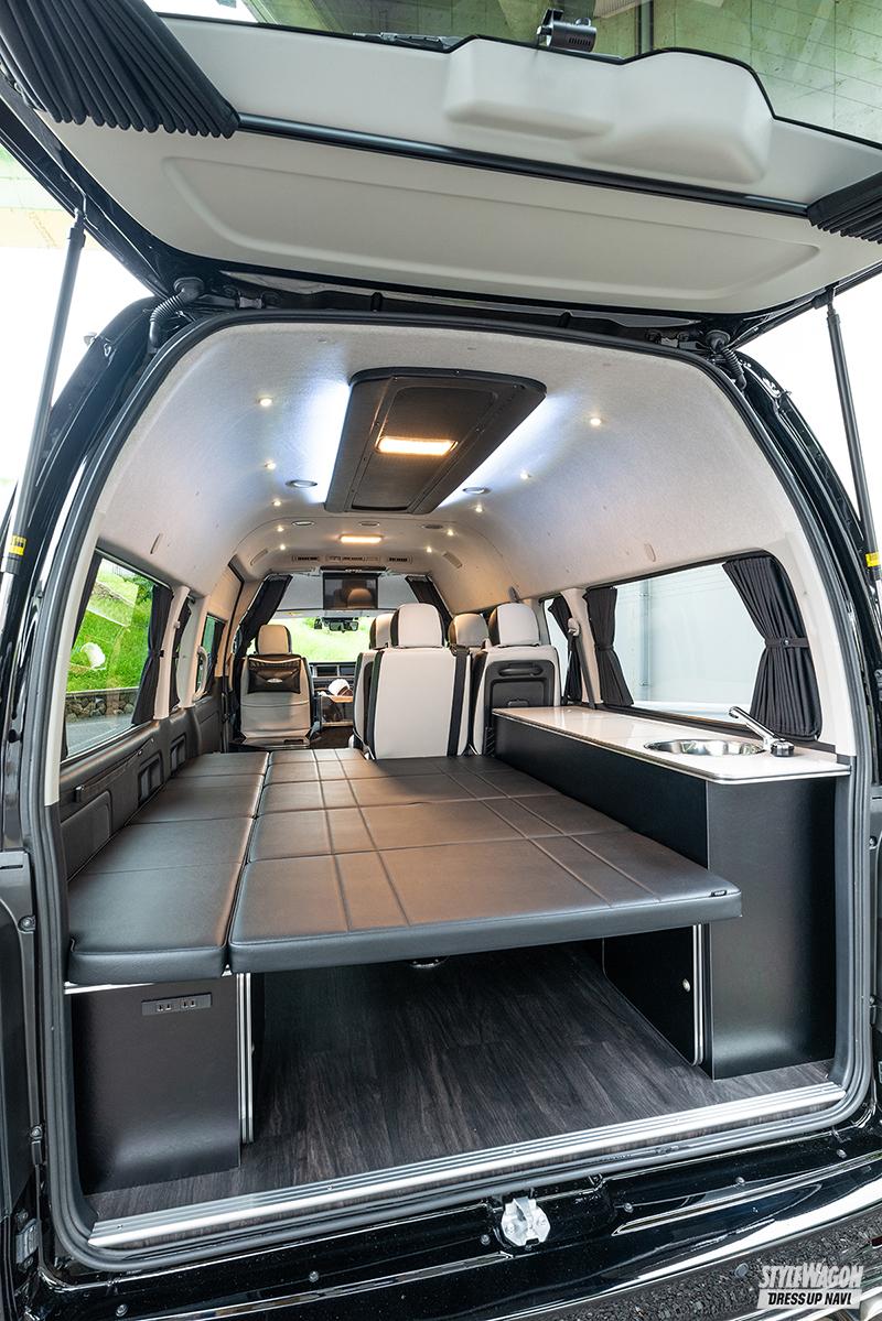 そんなレガンスのキャンパースタイル2は、6人乗りの8ナンバー仕様。後部座席に4名が乗車できるからファミリーユースなどにも最適で、大人1名と子供2名が就寝できるから車中泊車としても優秀。フルフラットからラウンジ仕様まで多彩なシートアレンジを実現できるのもポイントで、シンクや収納スペース、テーブルにポータブル電源といった必要最低限のキャンピング設備も標準装備される。