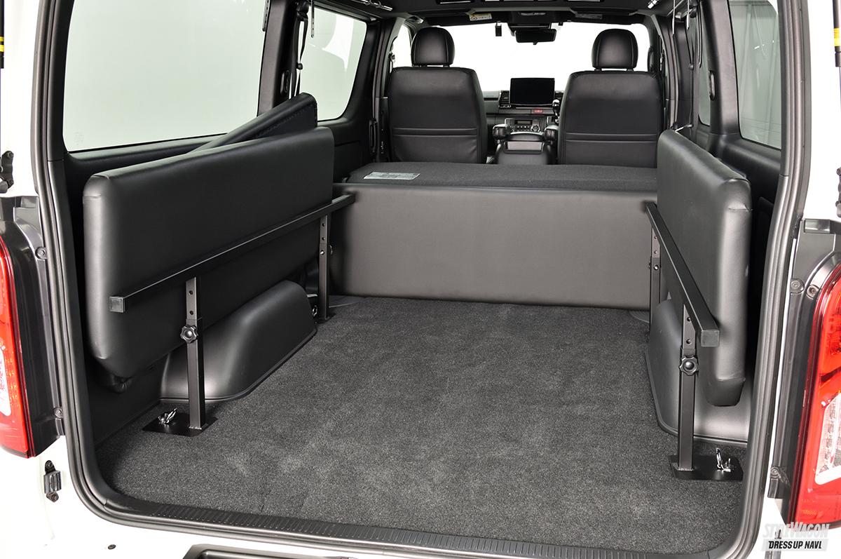アベストといえば、ヴァーティカルアローシリーズなど人気ライティングアイテムを多く揃えているが、今回紹介するオリジナルのベッドキットも、ハイエースオーナーからの支持を集める大人気商品。ベッドマットは4枚構成となり、セカンドシートもフラットにすると全長で約3m(助手席裏側まで)となり、広大なベッドスペースを確保することが叶う。高さ調節も5段階(32㎝、37㎝、42㎝、47㎝、52㎝)から行うことも可能で、積む荷物など広い空間を無駄なく活用することもでき、荷室満載で出掛けるハイエースユーザーにとっても見逃せないところのはず。