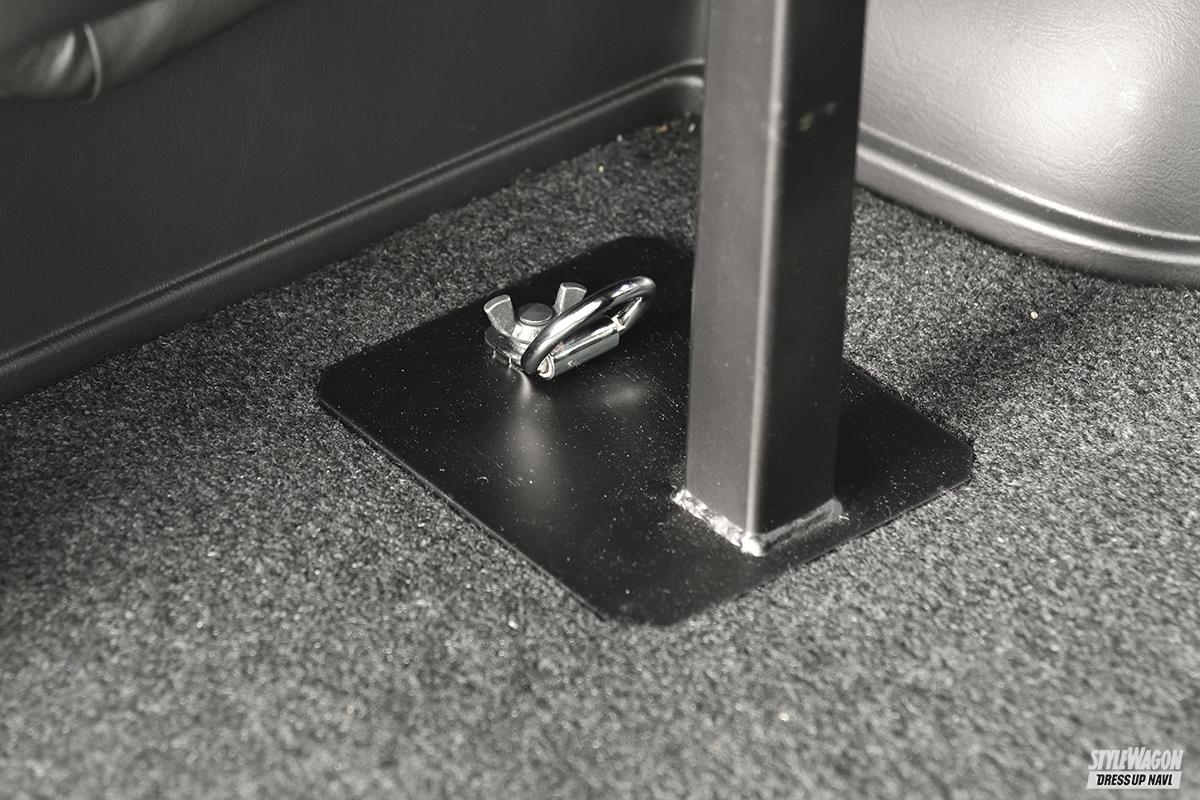 純正のタイダウンフック穴を使用してベッド足を装着する。特殊な工具等は必要なく、レンチなど簡単な工具さえあれば組み立てられる。