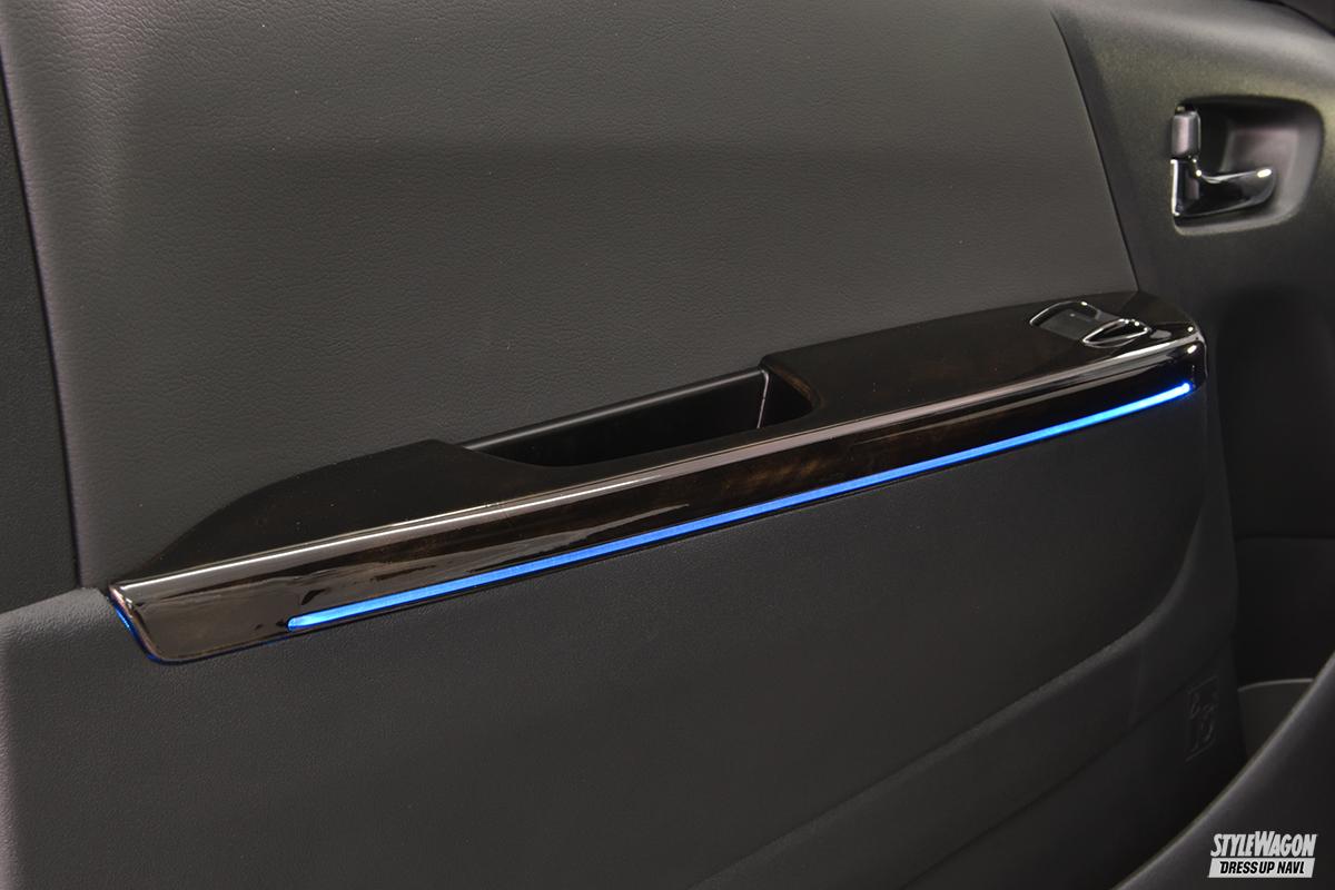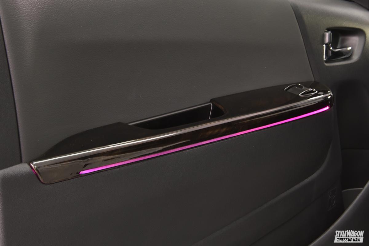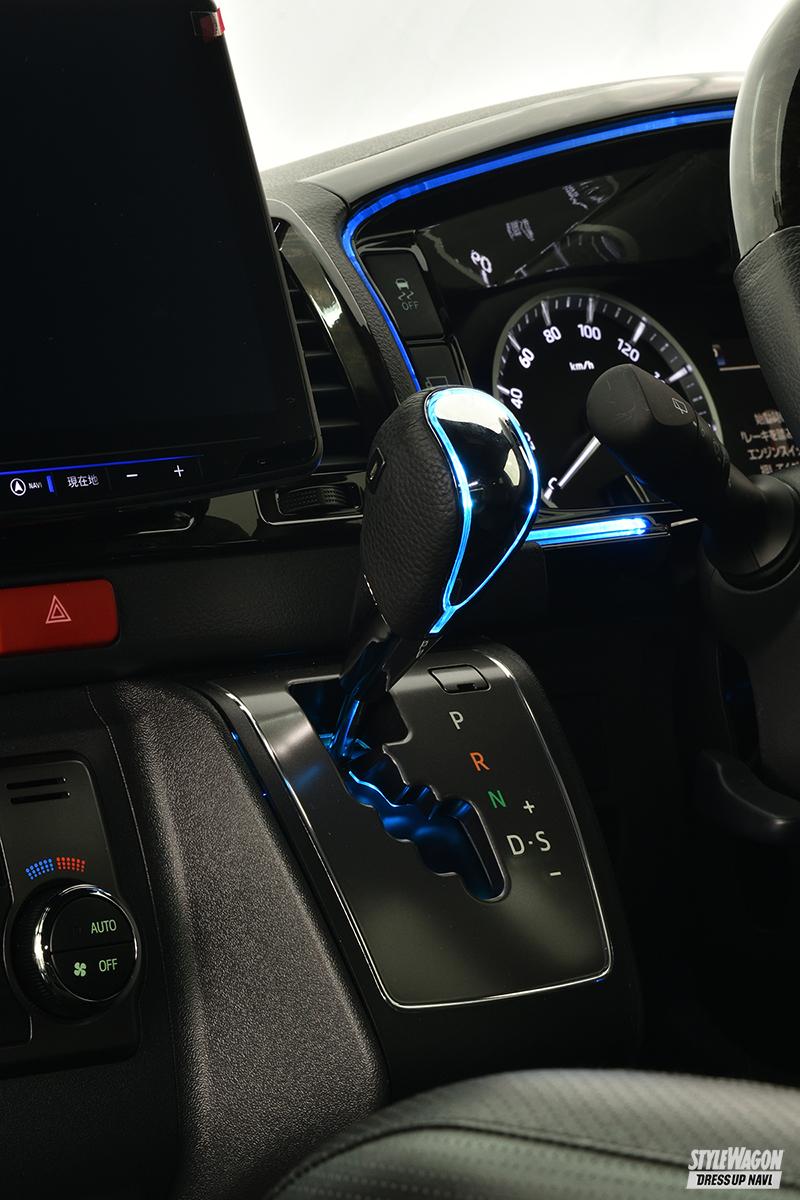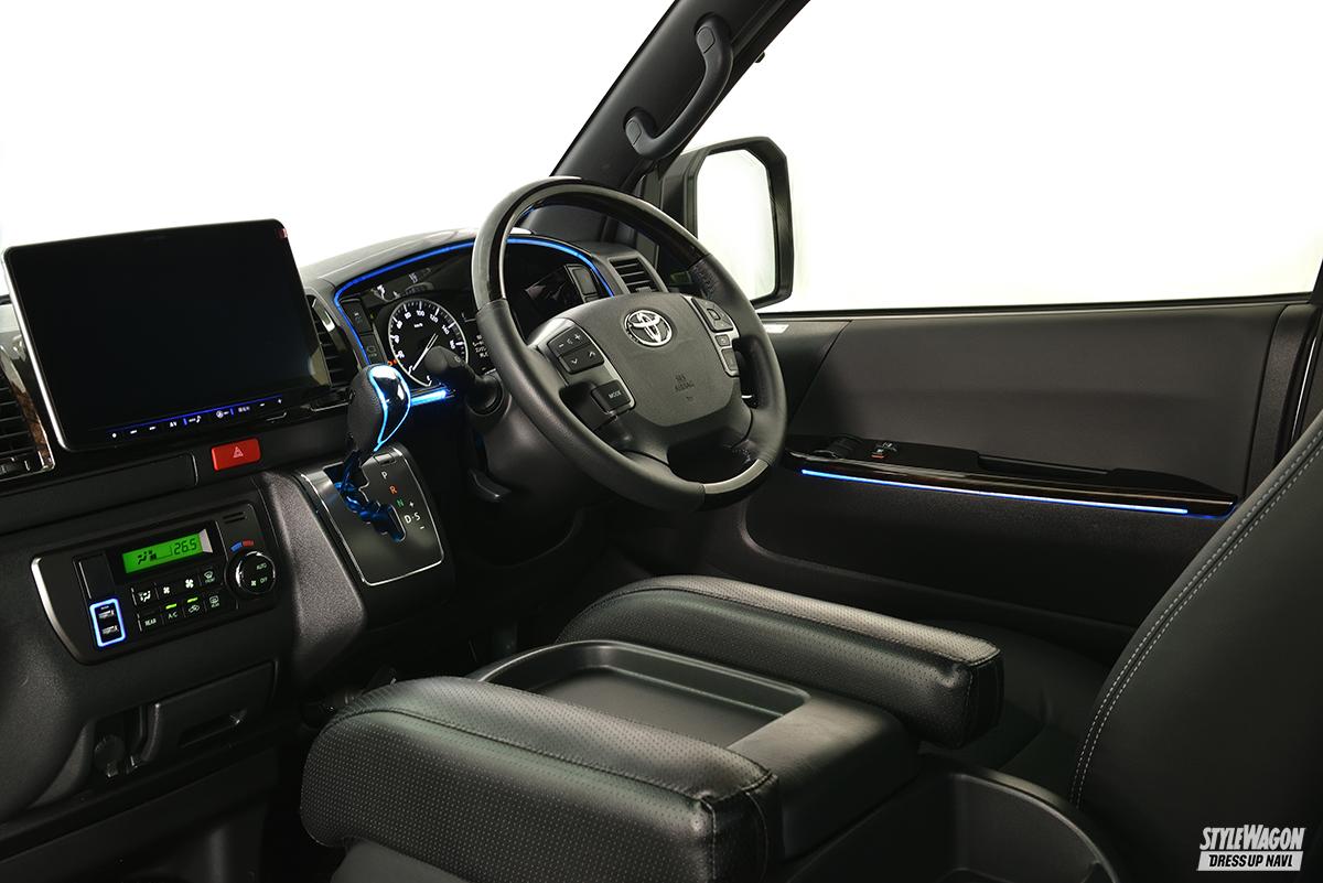 車内を幻想的に彩ることに役立つのが、この項で紹介する「スカイビューナイトライン」だ。16種類のライティングカラーと5段階の明るさの設定を付属のリモコンで切替可能で、無骨な印象を受けるハイエースの前席周りを機能的、かつ幻想的に演出できる。アイテム構成はウインドウトリムSWパネルとシフトゲート下へ仕込むLEDがセット。好みの設定を見つけ出せば、より愛着が増すこと間違いなし!
