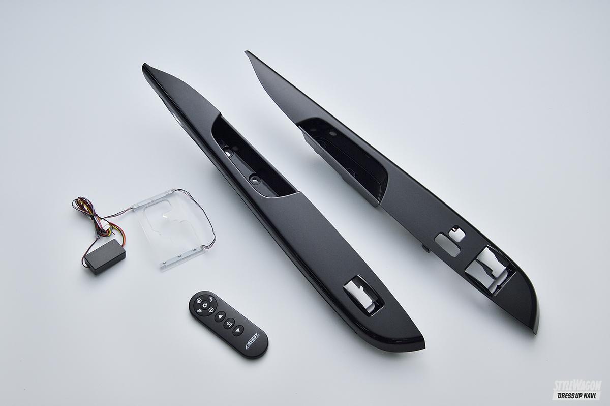キットは本体(シフトゲート部とウインドウSWパネル)とリモコンが付属。ウインドウSWパネルはピアノブラックと黒木目マホガニー調がラインアップ。