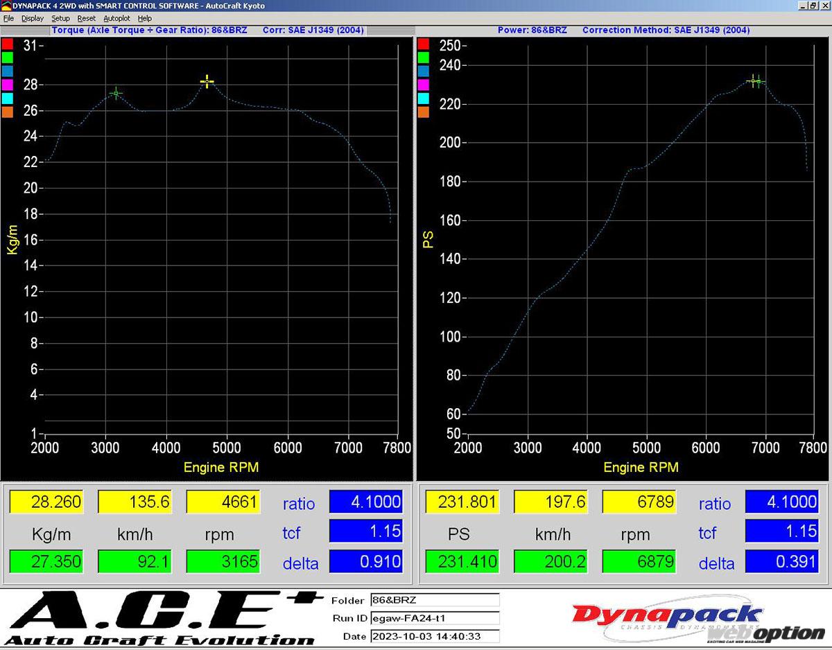 ダイナパックを使ったパワーチェックでは、吸排気&ECUチューンによって231.8ps&28.2kgmを発生。前期ECUのままでもFA24のポテンシャルが全域で引き出せるため、仕様によってはフットワークのリセッティングやボディ補強などの必要性を痛感するはずだ。
