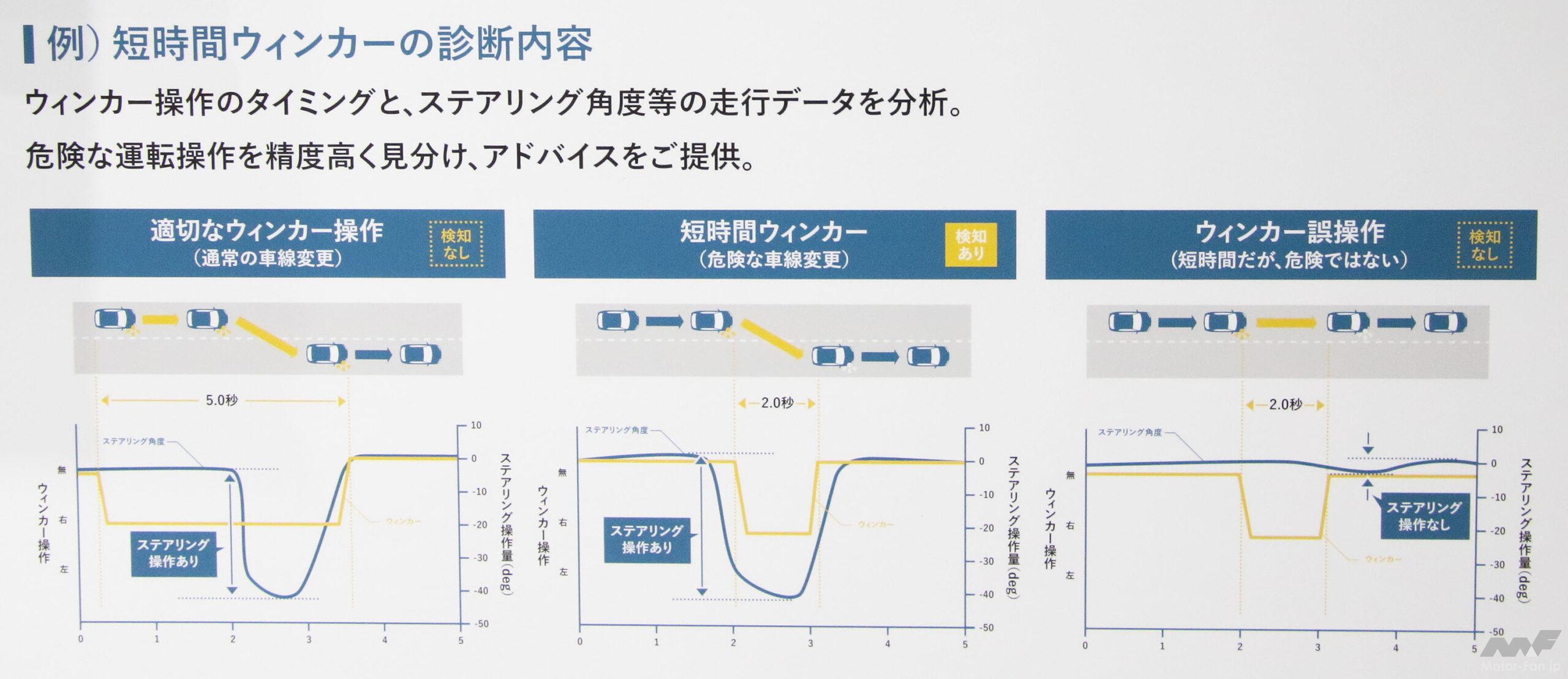 ウィンカーを点灯してからステアリングを操作し、車線変更などを行うまでの間隔が約2秒以下だった場合は「短時間ウィンカー」と診断し、早めにウィンカーを出すようアドバイスする。