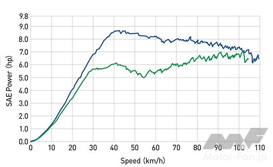 フルノーマル状態から「プーリー」と「クラッチ」をMFR製に換装すると……たった2つのパーツ交換だけで、ご覧の通りパワーカーブは一気に改善。ピークパワーの上昇もさることながら、実用域での高出力化が頼もしい!
