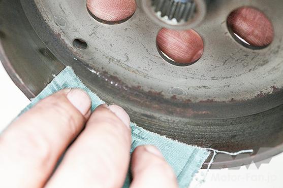 クラッチを変えるメリットとして挙げられるのは、ミート力のアップ(滑りによるパワーロスを抑える)だ。今回装着したクラッチはノーマルより硬いスプリングが組まれており、クラッチミートの回転数を高くできる。4スト車の場合はトルクがあるので軽量化してもそれほど変化しない。最後の味付けといったメニューと覚えておこう。