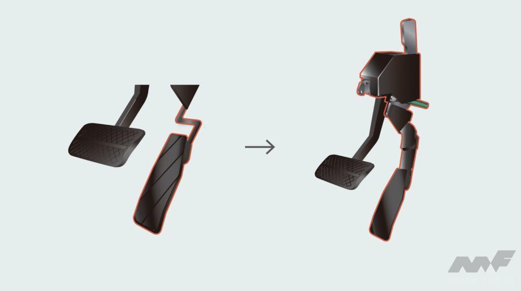 試乗デモ機に座り、急アクセルのように思いっきりアクセルペダルを踏んでみると、ペダルが一番奥に当たったあたりでアイアクセルが作動し、既存のアクセルペダルにリンクしている部分がリリースされ、アクセル解除の動作に。それと同時にブレーキペダルに添えられた銀色のパーツがブレーキペダルを押し込んでブレーキを掛けるという一連の動作が行われた。特に大きな振動や違和感もなく安全にアクセルが解除された印象だ。