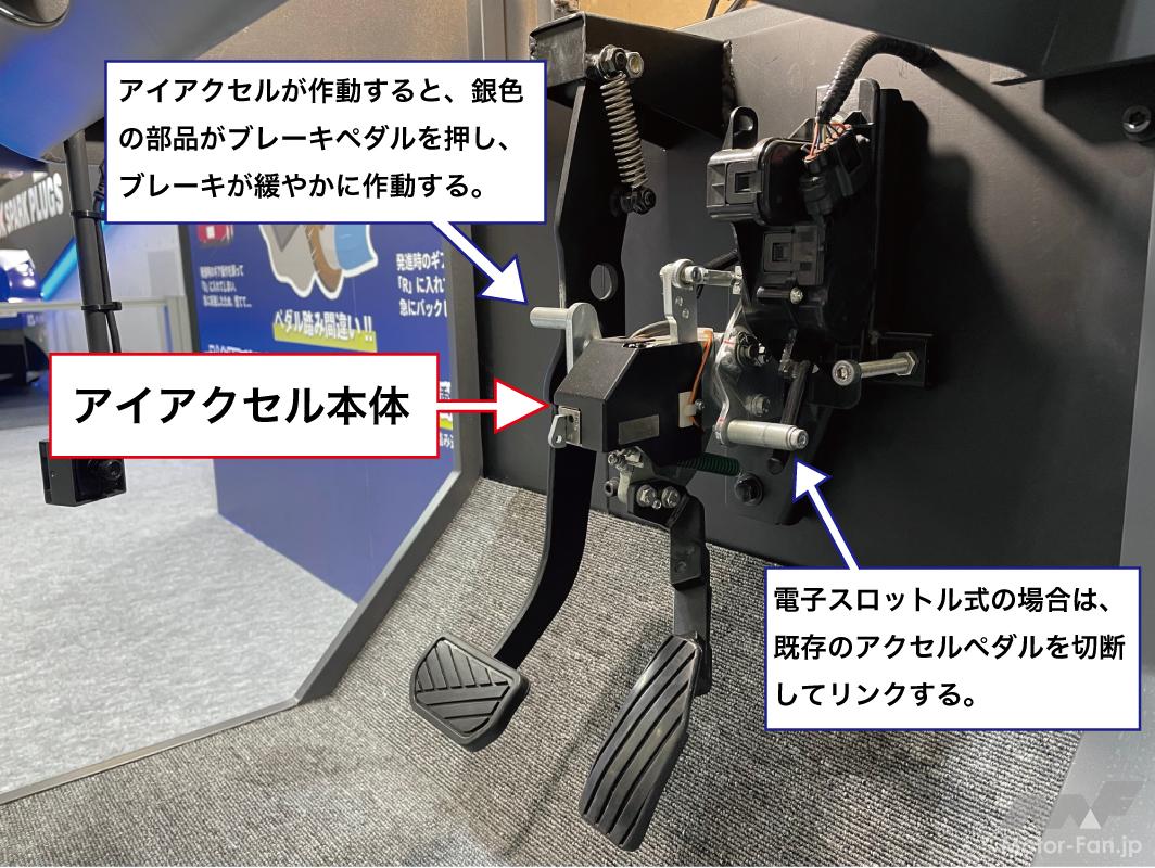 試乗デモ機に座り、急アクセルのように思いっきりアクセルペダルを踏んでみると、ペダルが一番奥に当たったあたりでアイアクセルが作動し、既存のアクセルペダルにリンクしている部分がリリースされ、アクセル解除の動作に。それと同時にブレーキペダルに添えられた銀色のパーツがブレーキペダルを押し込んでブレーキを掛けるという一連の動作が行われた。特に大きな振動や違和感もなく安全にアクセルが解除された印象だ。