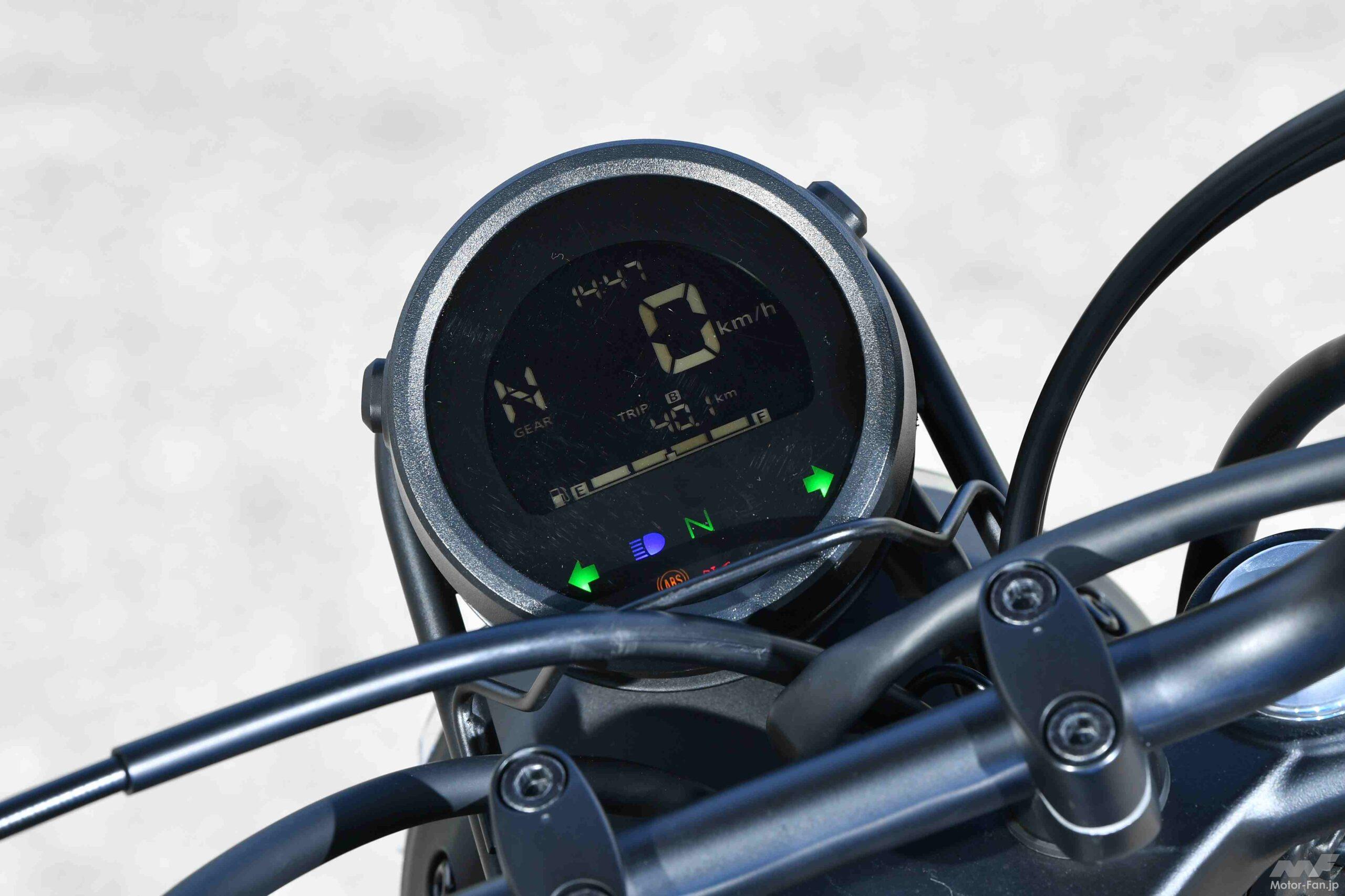 幅広で絞りが少ないハンドルや小ぶりなガソリンタンク、単眼のメーターは、スクランブラーの流儀に従ったパーツ。なおレブル250/500が堂々としたルックスと扱いやすさを両立するため、フロントフォークの傾斜角とフレームのキャスター角が異なるスランテッドアングル(30/28度)を採用するのに対して、CL250/500はいずれも27度のオーソドックスな構成。ネガ表示のLCDメーターはレブルからの流用だが、パイプを用いたクラシックテイストのステーは専用設計だ。