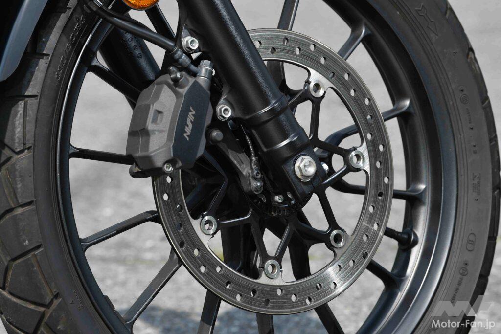 フロント片押し式2ピストン/リヤ片押し式1ピストンのブレーキキャリパーはレブルと共通だが、フロントφ310mm/φ240mmのディスクはレブルとは別物で、フロントはフローティング式を選択。世の中にはフロントのダブルディスク化を希望するライダーがいるようだけれど、個人的には現状の制動力とコントロール性に不満は感じなかった。ちなみに、過去にガチ1000kmで取り上げたレブル500のABSに抱いた違和感を、CL500はきっちり解消。