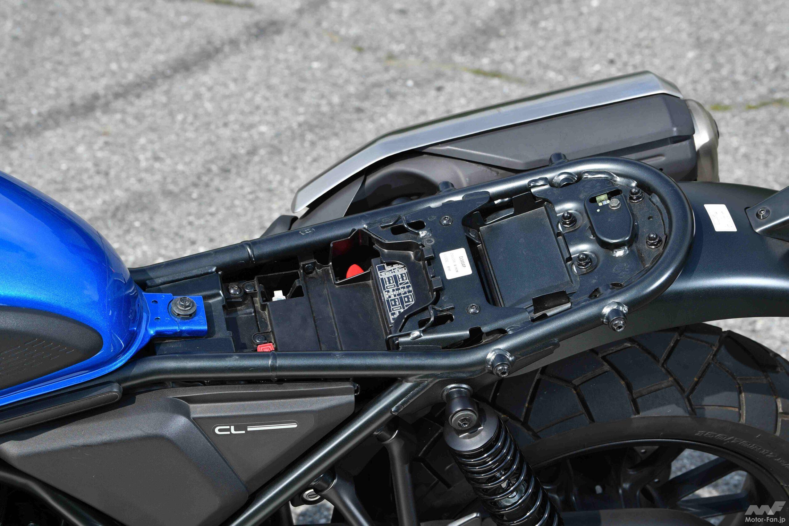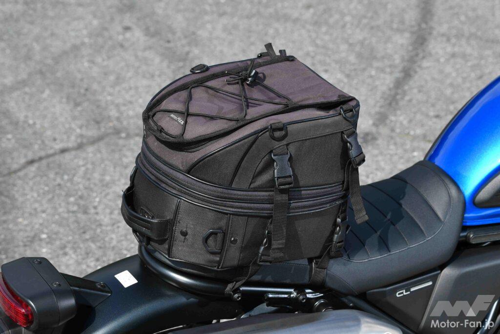 シートレールの側面にはリアキャリアやグラブバーの装着を意識したネジ×4が備わるものの、荷かけフックは存在しないので、ノーマル状態での積載性は優秀とは言い難い。ただし、シートにベルトを通すタイプのバッグを装着したみたところ(写真はタナックスのダブルデッキシートバッグ)、安定感はなかなか良好だった。なおホンダは積載性を高める純正アクセサリーとして、数多くのバッグをラインアップ。シート下にはETCユニットの搭載を前提としたスペースが存在。