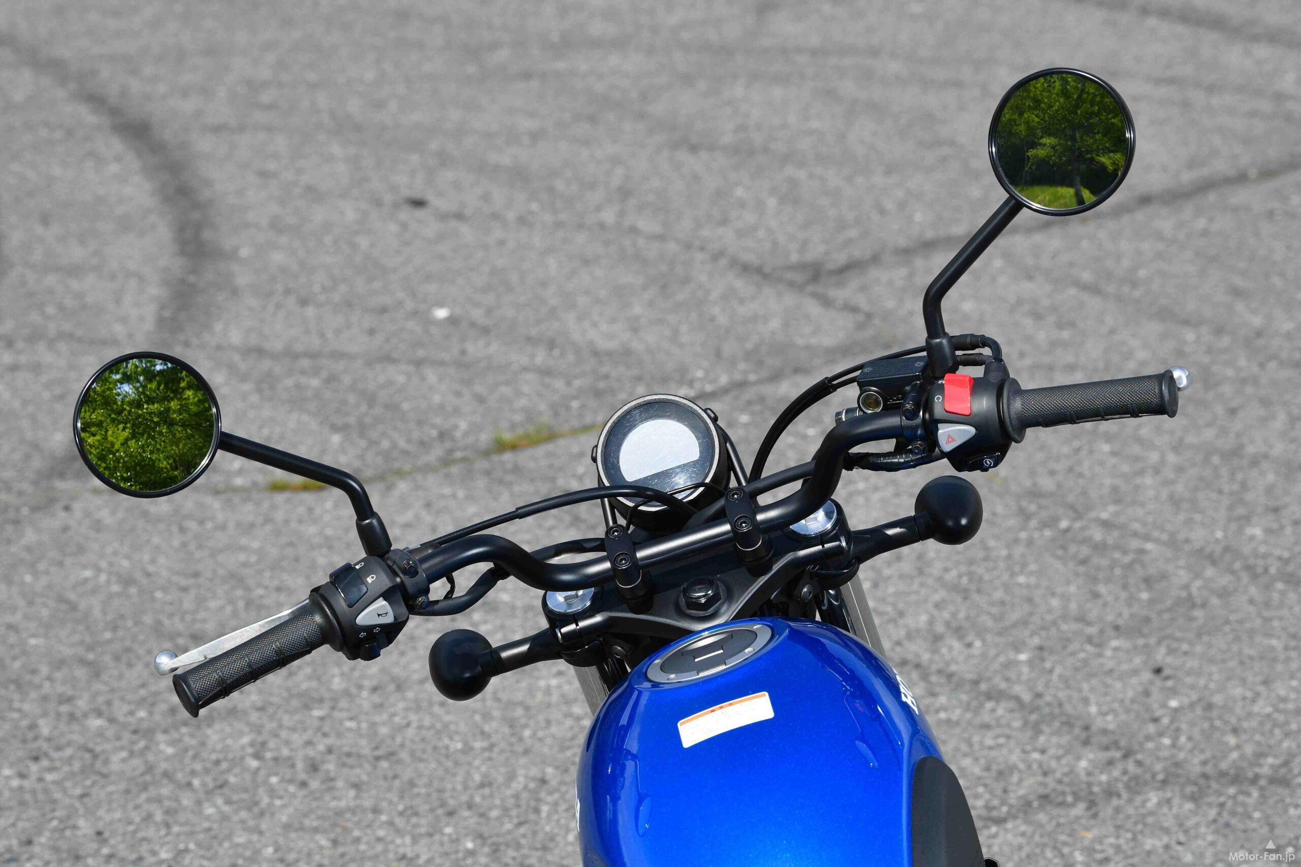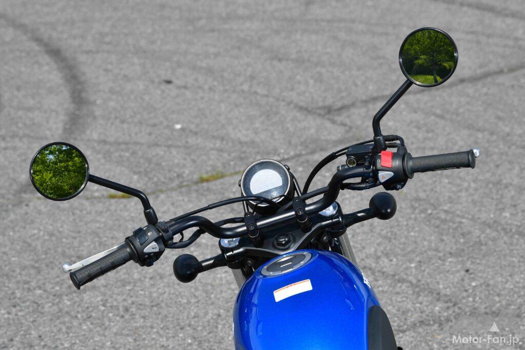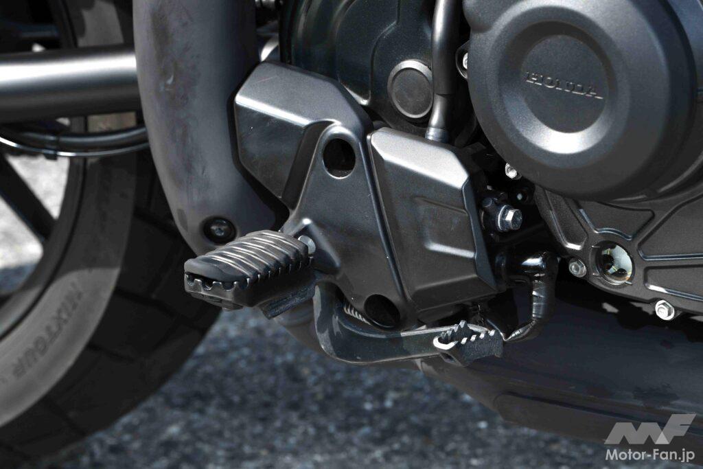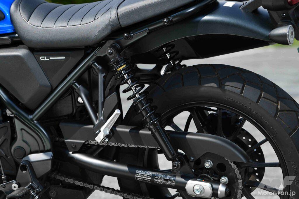 車重192kg、軸間距離1485mmという数値は、開発ベースのレブル500(191kg、1490mm)と大差がないものの、スクランブラーとしての資質を獲得するため、CLはレブル+3度となる38度のハンドル切れ角を確保し、最小回転半径をレブル-0.2mの2.6mに設定。そのおかげで取り回しはレブルより容易だが、近年のミドルネイキッドの基準で考えると、特筆するほど良好なわけではない。参考として他社のネオクラッシク系ミドルツインの車重/軸間距離/ハンドル切れ角/最小回転半径を記すと、ヤマハXSR700は188kg/1405mm/35度/2.7mで、カワサキZ650RSは189kg/1410mm/35度/2.6m。