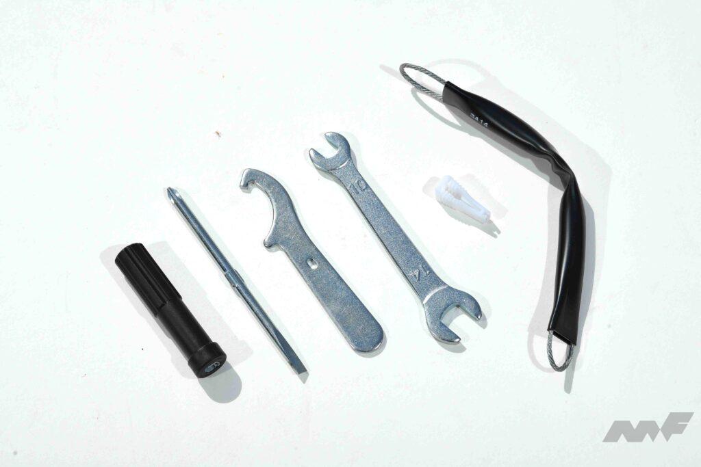 車載工具袋に収まる工具・道具は、差し替え式ドライバー、リアショックのプリロード調整用フックレンチ、10/14mmのスパナ、ヒューズプーラー、ヘルメットホルダーとして使用するワイヤーの5点。今どきのミドルでは平均的な点数でも、レブル500はスパナが1本多かったことを考えると、ちょっと残念な気がしないでもない。