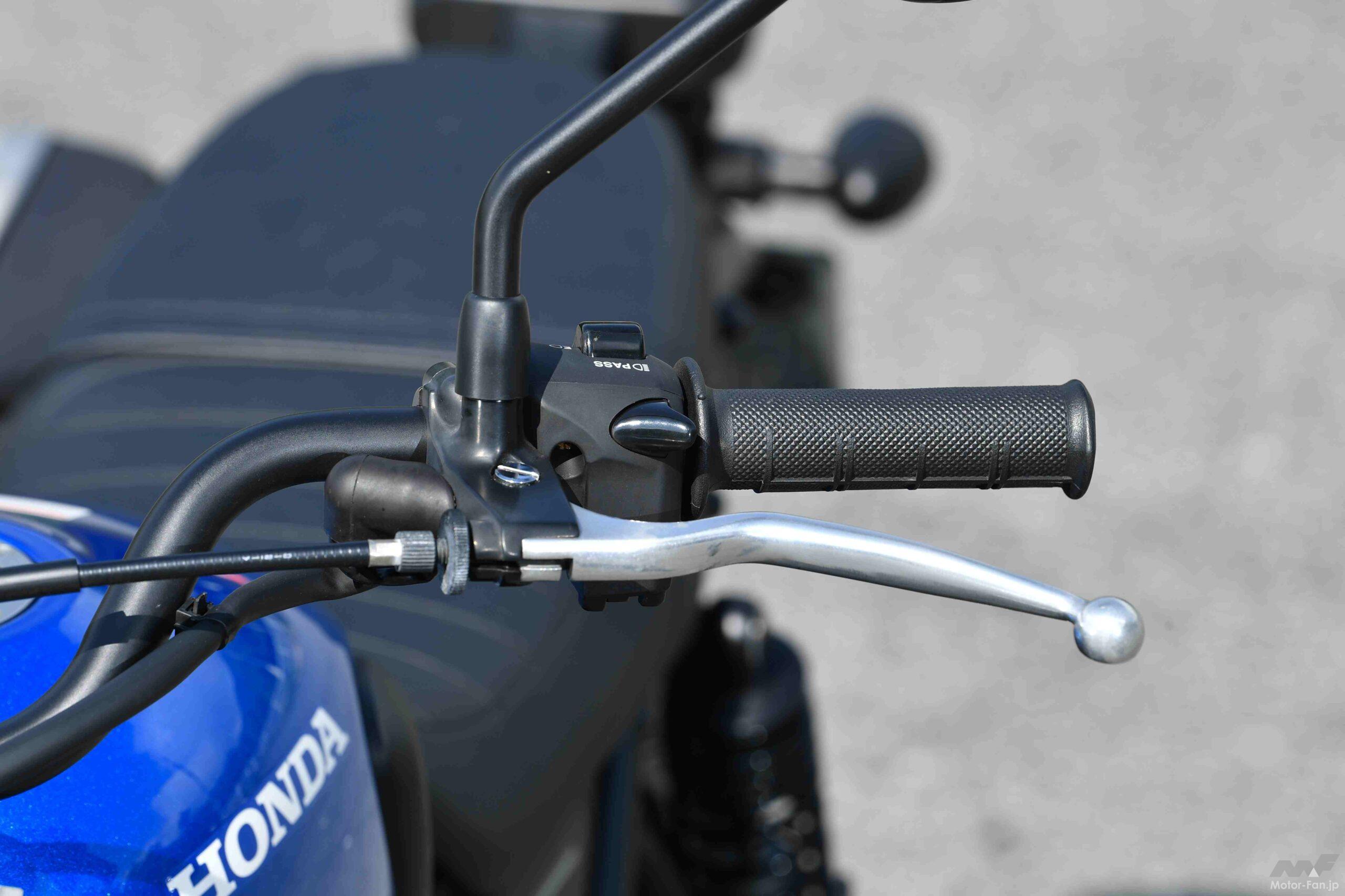 グリップラバーは細身のオフロードタイプ。バーエンドウェイトは備わらないものの、高回転域でグリップ周辺に発生する振動はまったく気にならないレベルだった。ブレーキ/クラッチレバーの位置調整機構はナシ。