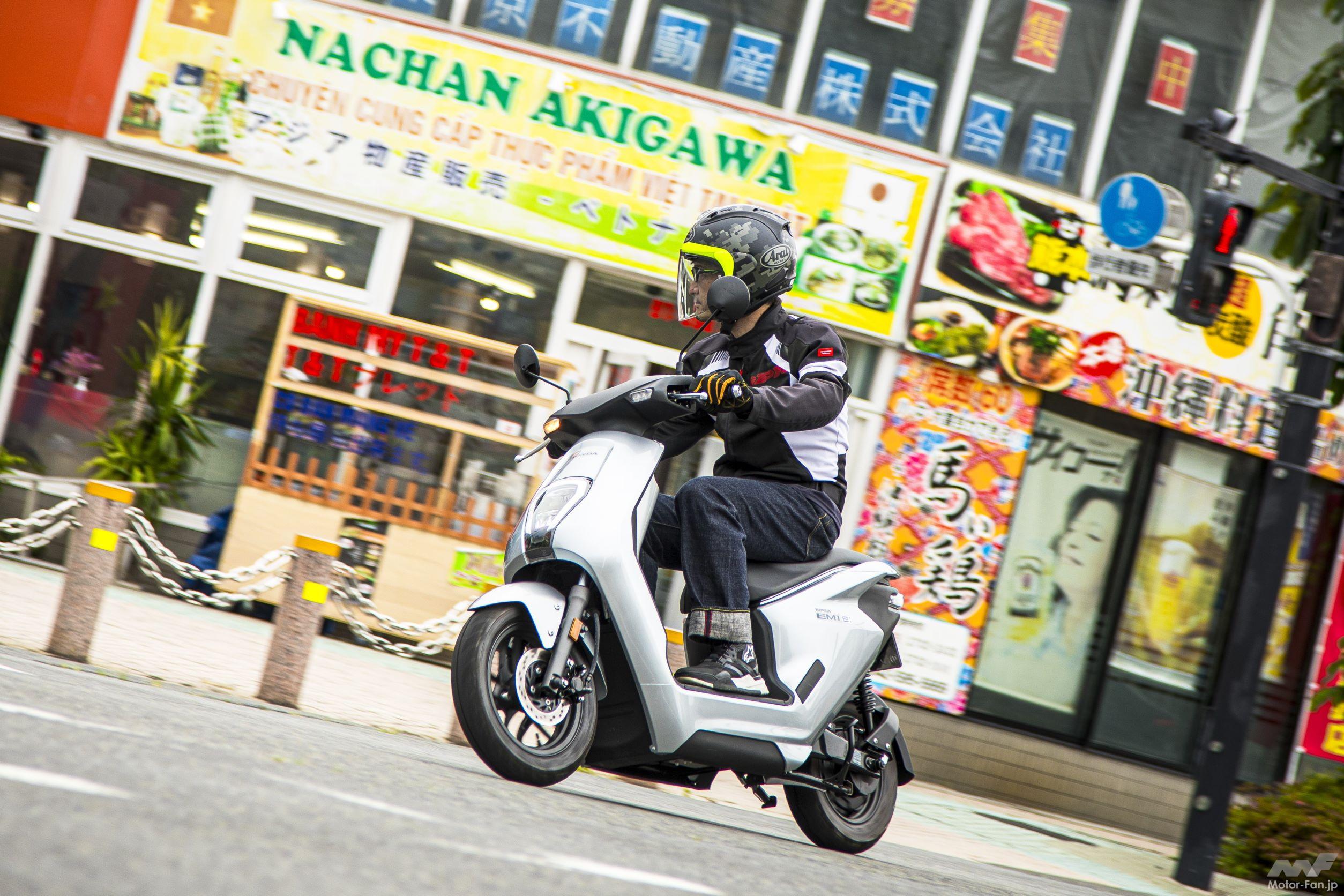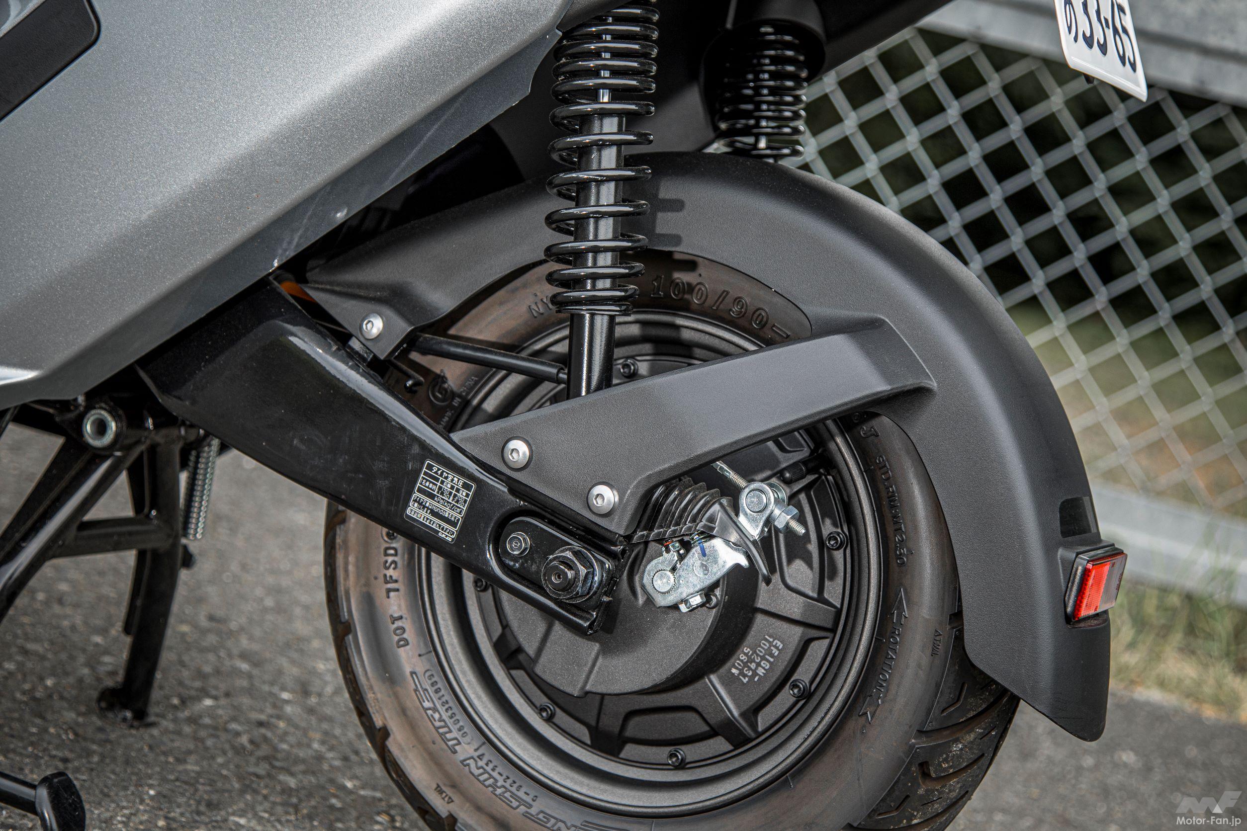 ハンドリングは、リヤ10インチホイールによる低重心が効いているのか、発進~微速域でフラつきにくく、極めてニュートラルで扱いやすい。加えて、遠心クラッチのような加速時のタイムラグが発生しないので、ビギナーほど内燃機関より乗りやすいと感じるだろう。サスペンションの動きは車両価格なりで、荒れた路面や大きなGが加わった際にはやや心許ないが、これも動力性能と同様に日常の足として使うなら特に問題はないはずだ。