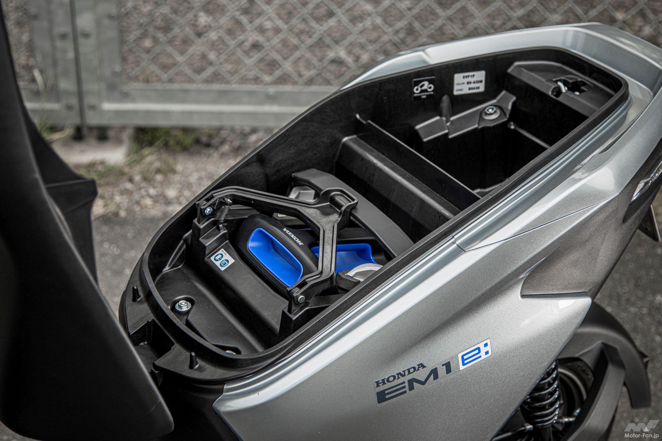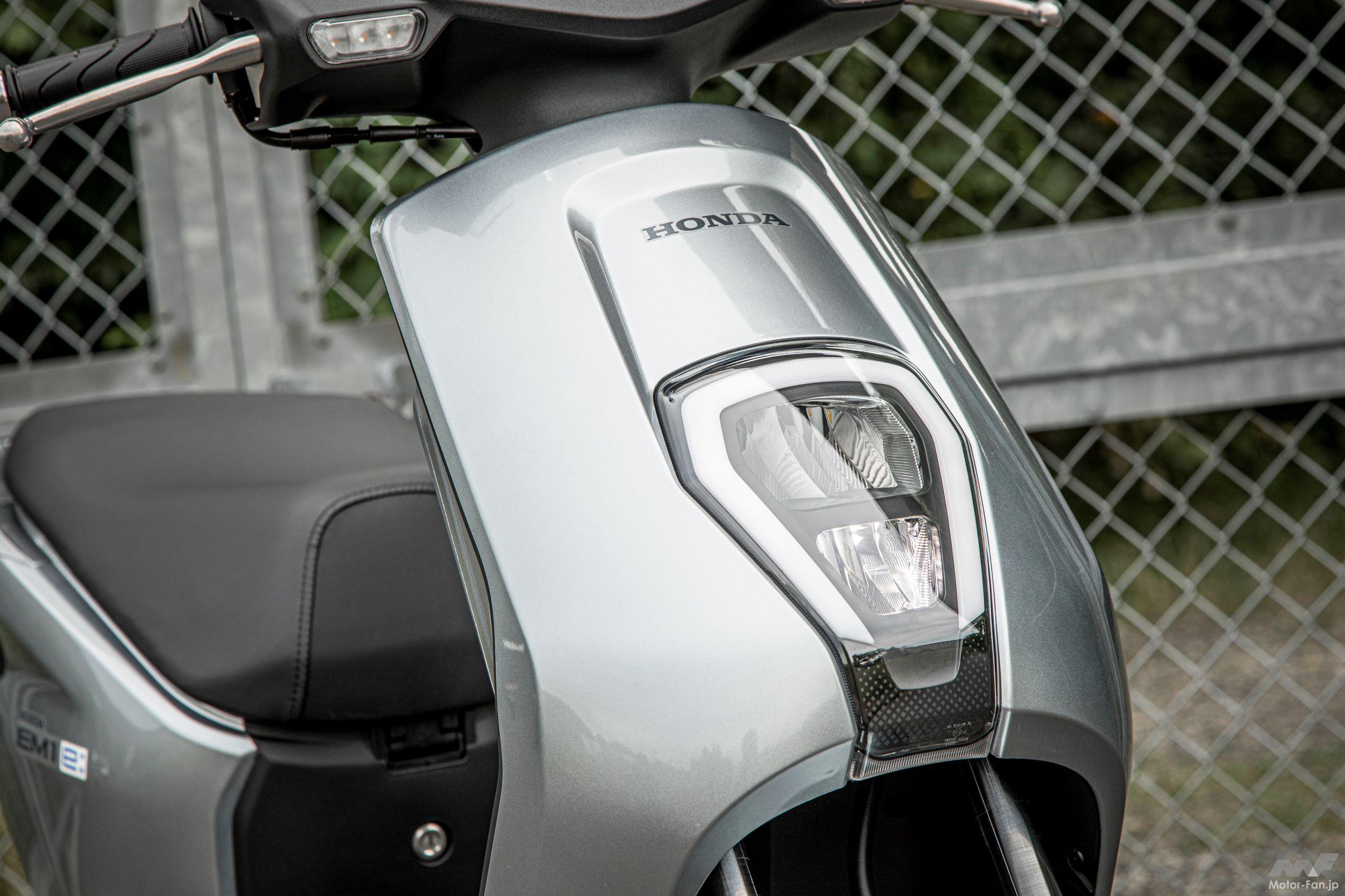 このEM1 e:は前後でホイール径が異なり、フロントに12インチ、リヤに10インチを採用している。同じ電動スクーターのベンリィe:シリーズや原付二種のリード125も12/10インチという組み合わせなので、この方がシート下のスペースを稼ぎやすいなど、何らかのメリットがあるのだろう。