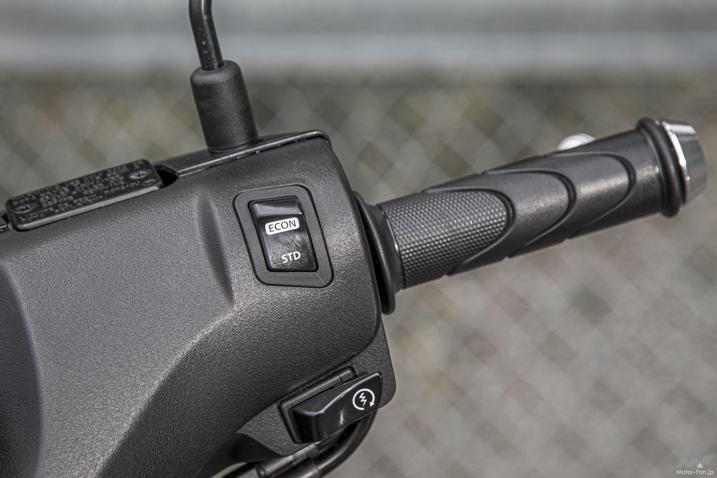 走行モードはSTDとECON(エコノミー)モードの2種類で、今回の試乗では前者をメインに使用した。発進加速のスムーズさは、ベンリィe:シリーズやPCXエレクトリックで経験済みだが、このEM1 e:を含めホンダのモーター制御は感心するほど緻密だ。90Nmというリッタークラス並みのトルクをわずか25rpm(!)で発生するモーターを搭載しているだけに、これを完璧に制御できなければ滑らかなスタートなど不可能だからだ。