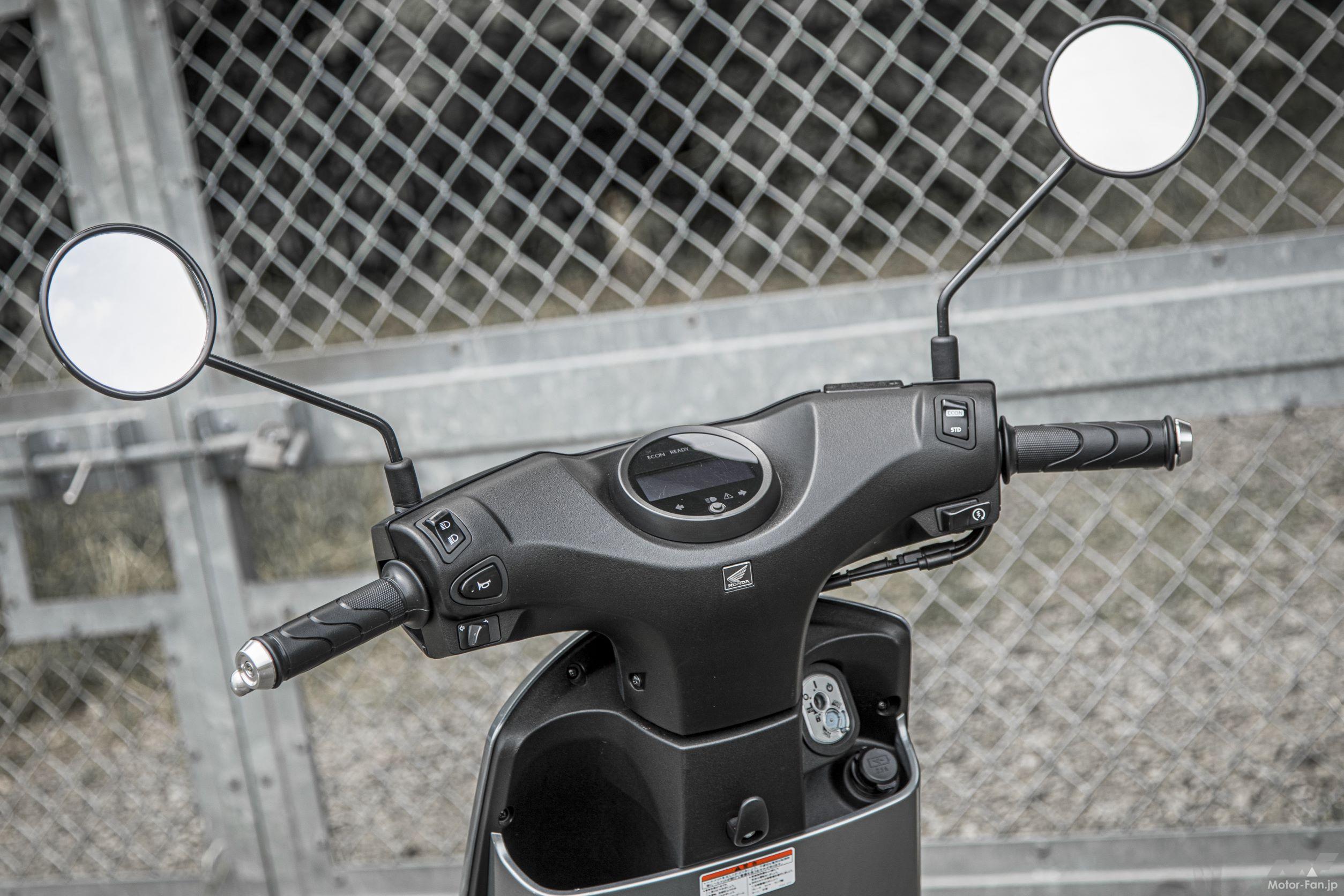 加速性能については、法定速度の30km/h付近までは原付一種スクーターと同等か、やや速いかなと感じるレベルだ。ちなみにクローズドエリアで試したところ、最高速はメーター読み49km/hで、このあたりでパワーがスッと抜けるような感触がある。おそらく50km/hを超えないように制限しているのだろう。登坂路ではスロットを全開にしていても徐々に速度が落ちていき、勾配が10%を超えたところで18km/hまでダウンした。電動アシスト自転車に乗る高校生に追い付かれたのは事実だが、とはいえ平坦路がメインの使い方であれば、動力性能的に過不足はないと言えるだろう。