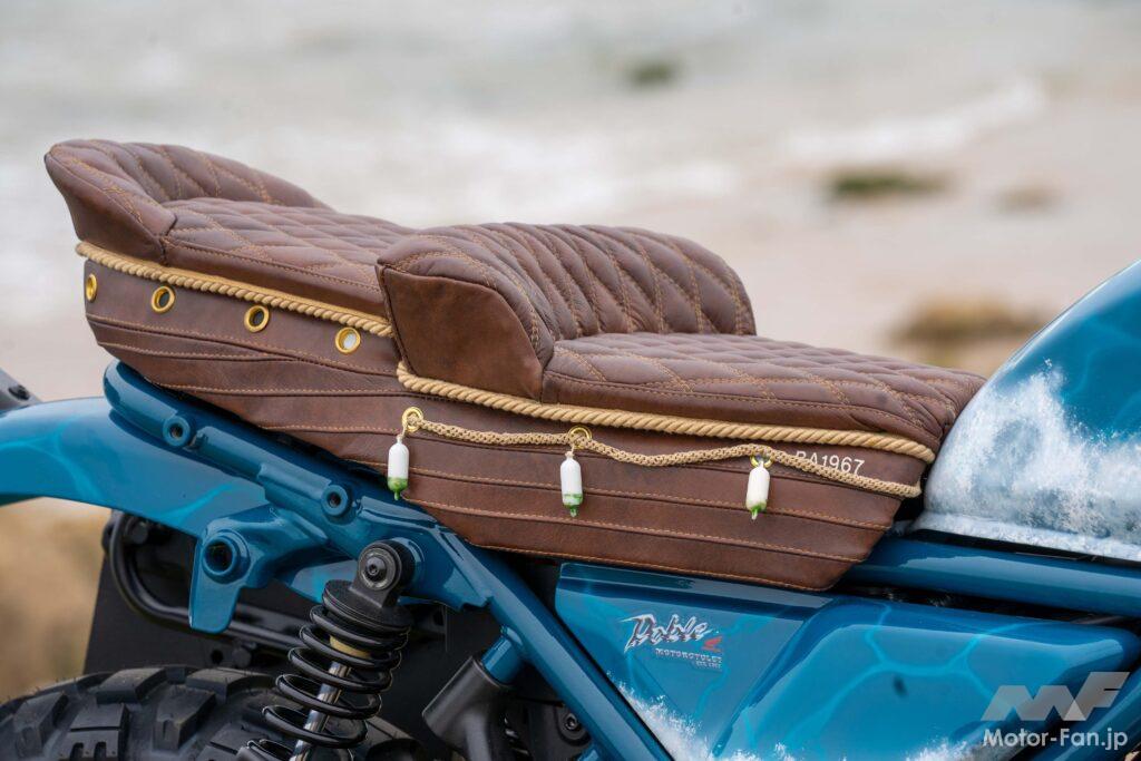海の美しさと力強さをオマージュして、南ロンドンのドブールモーターサイクルチームが製作。オーシャンブルーとグリーンのカラーリングが波を表現し、フューエルタンクにはエアブラシでポセイドンが描かれている。真鍮のライトガードや段付きのシートは、大航海時代の大型船をイメージ。