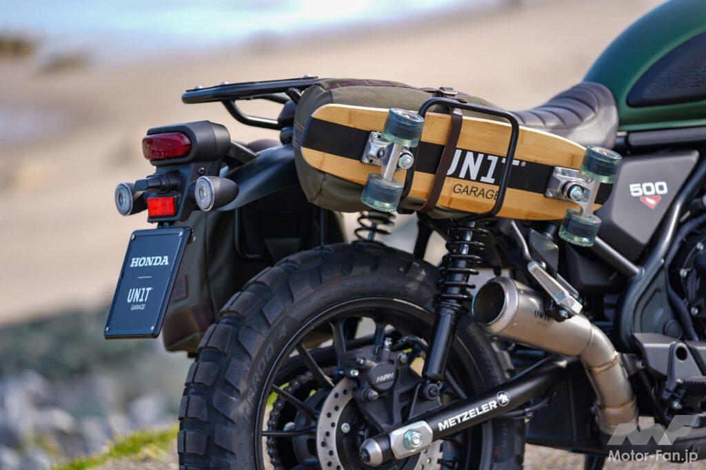 イタリア語で「オフロード」を意味する「Sterrato」と名付けられたこの車両は、その名が示す通りオフロード走行をイメージ。ホンダ純正オプションアクセサリーを使用して、CL500をオフロードマシンし仕上げている。派手さはないが、オフ車っぽさを表現している。