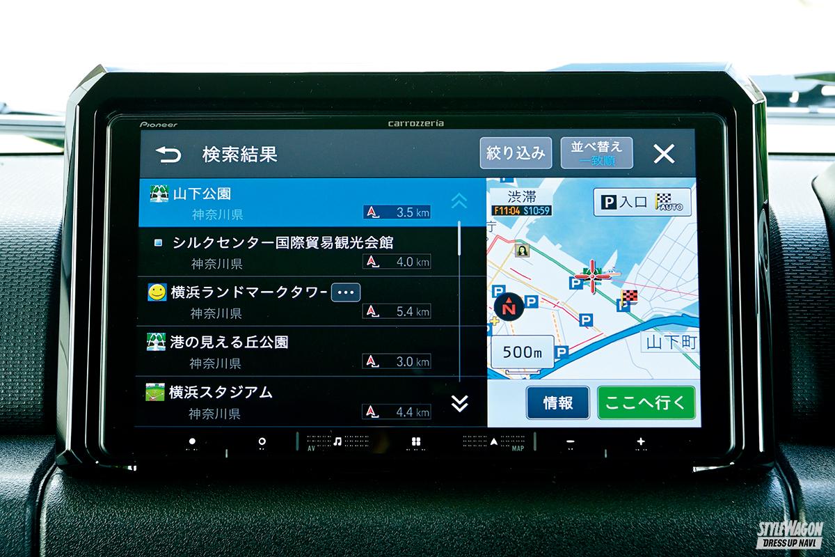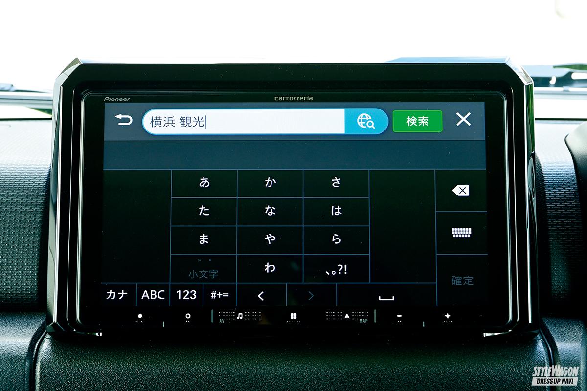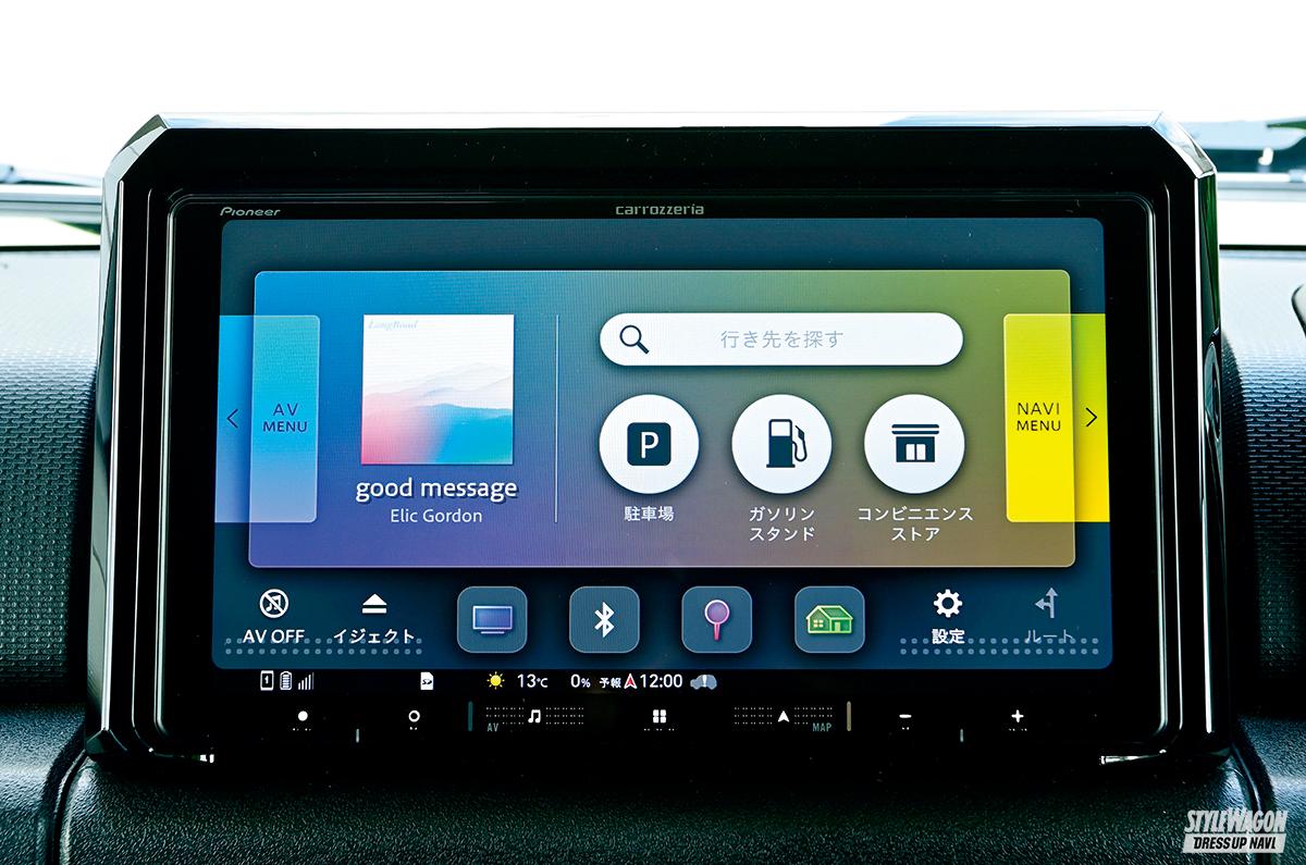 ジムニーにお薦めなのは、楽ナビ最大9インチモデル。純正最大の8インチよりも大画面で、まず何よりも見やすい。インストールには、専用の取り付けキットが必要だが、ジムニーの内装とも調和し、自然で違和感がないのがポイントだ。