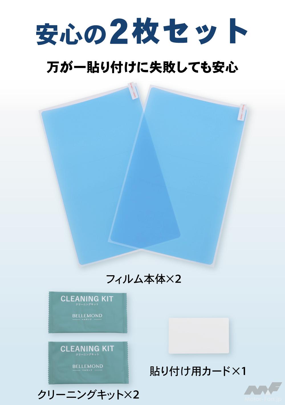 パッケージにはフィルムとクリーニングキットが2セット含まれており、貼り付け作業に失敗しても安心だ。