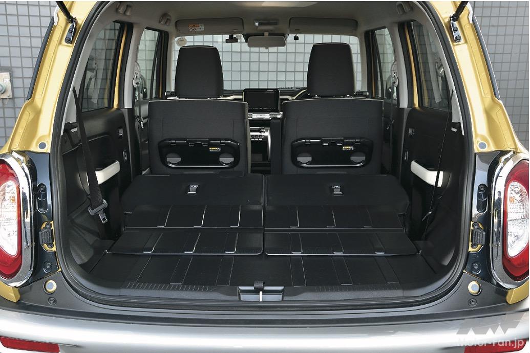 後席を最後端にスライドさせると成人が足を組めるほどの広さとなり、前席の背面にはパーソナルテーブルも設定されている。荷室を広げたい場合はスライドを適宜前方に調整するとよい。左右独立してシートアレンジできるのも重宝する。