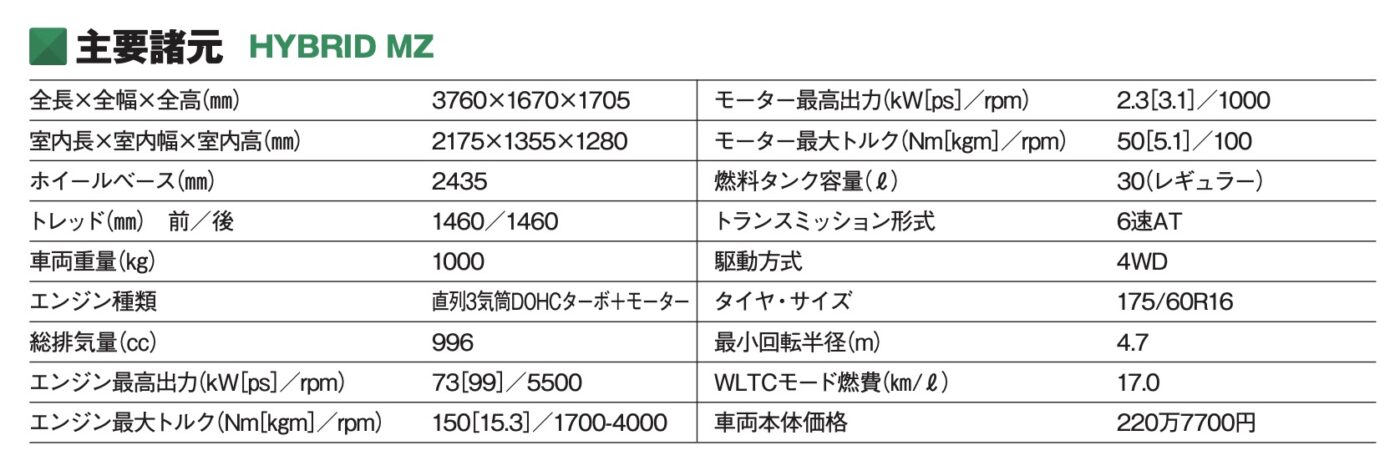 荷室の横幅が1140mmもあるので、ゴルフバッグを横向きに積める。フロア下に大きなアンダーボックスがあり、FF車ならA型のベビーカーを立てて積むこともできる。知れば知るほど各部が機能的に設計されていることに感心する。1.0l直噴ターボにはトルコンATとマイルドハイブリッドが組み合わされるのも特徴で、ISGのアシストで軽やかに加速できる。軽自動車と違ってトレッドが広いおかげでコーナリングも安定している最新版は先進運転支援が進化し、全車速追従機能付きACCや車線維持支援機能が新たに採用されるなどした。