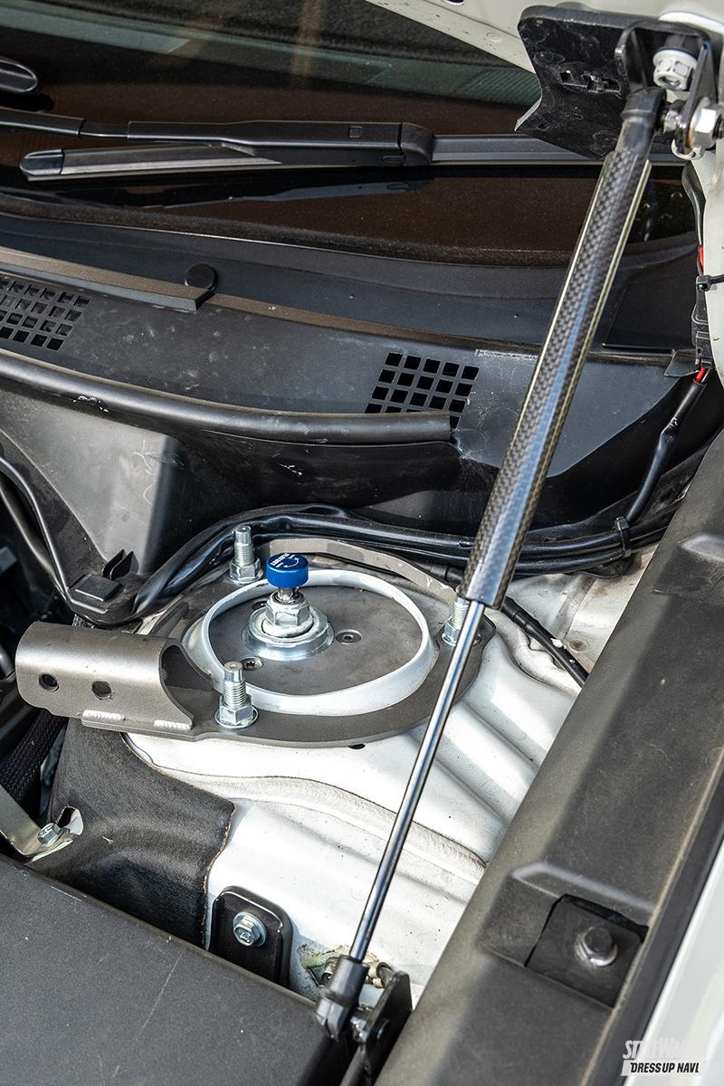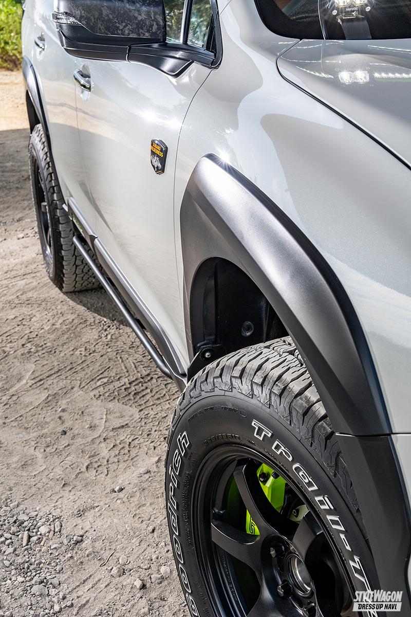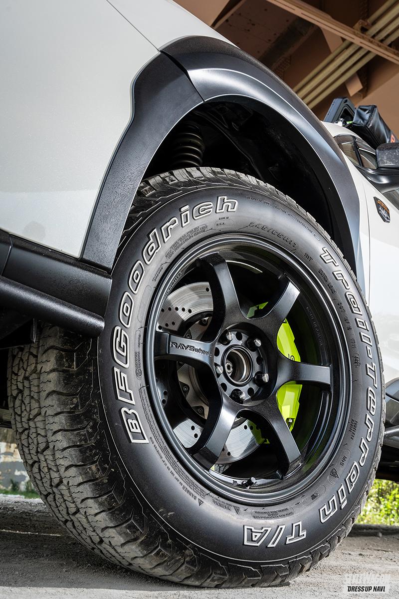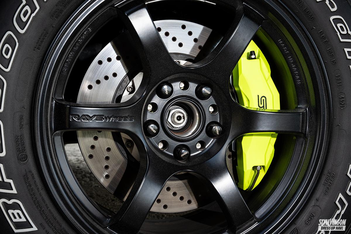 中でもコダワリが注がれたのが一切の妥協を排した足まわり。リフトアップを前提としたアメリカFLATOUT社の車高調とRallitek社のスペーサーを組み合わせ、前後80ミリものリフトアップを実現した挙げ句にジオメトリーの最適化も図っている。同時に軽量なホイール(これは日本製!!)と強力なブレーキを組み合わせることで、走るフィールドを問わず「走る・曲がる・止まる」の三大原則をスープアップさせている。