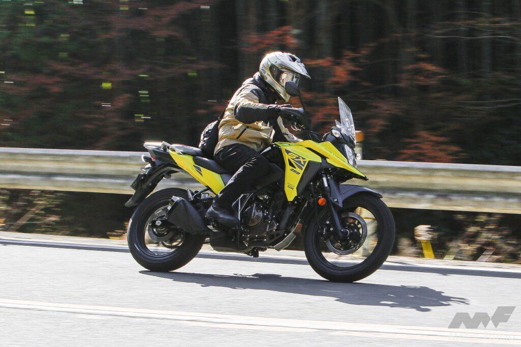 セル一発で目覚めたエンジンは、250としてはやや大きめなサウンドを放ちます。かといって耳障りな音ではないので、長時間走行で疲労を誘発するようなことはありません。 シングルエンジンということでタタタッと歯切れのあるパワーフィーリングを想像していたのですが、実際にはかなり穏やかな感覚で、その中に力を体感するといったものです。吹け上がりはそれほど俊敏ではなくアクセル開度に合わせて回転が上昇するタイプです。しかもフラットな特性なので、パンチ力こそありませんが非常に使いやすいエンジン特性だと感じました。このように全体に穏やかさが目立つエンジンですが、スタートダッシュで他車に後れを取ることはありませんし、高速道路の進入で加速不足を感じることもありません。さらに高回転までストレスなく回るエンジンなので、高速走行も余裕でこなしてくれます。全回転域で同様の特性を発揮してくれるため、市街地からワインディング、フラットダート、そして高速道路まで気を遣わずにアクセルコントロールできます。