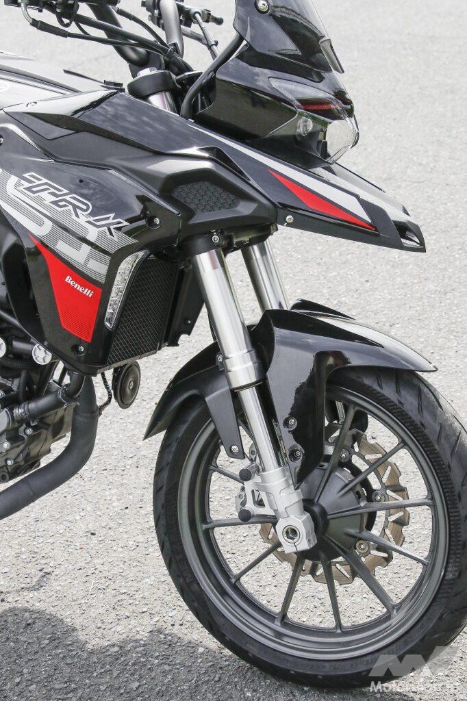 スクランブラーであるレオンチーノ250と共通のフレームに搭載されたエンジンは、249㏄の水冷DOHC4バルブ単気筒。最高出力19kW/9,250rpm、最大トルク21.1Nm/8,000rpmというスペックです。ライバルとなるVストローム250がそれぞれ18kW / 8,000rpm、22Nm / 6,500rpm、そしてVストローム250SXが19kW / 9,300rpm、22Nm/ 7,300rpmというスペックなので、比較するとやや高回転型のエンジンとなっています。
