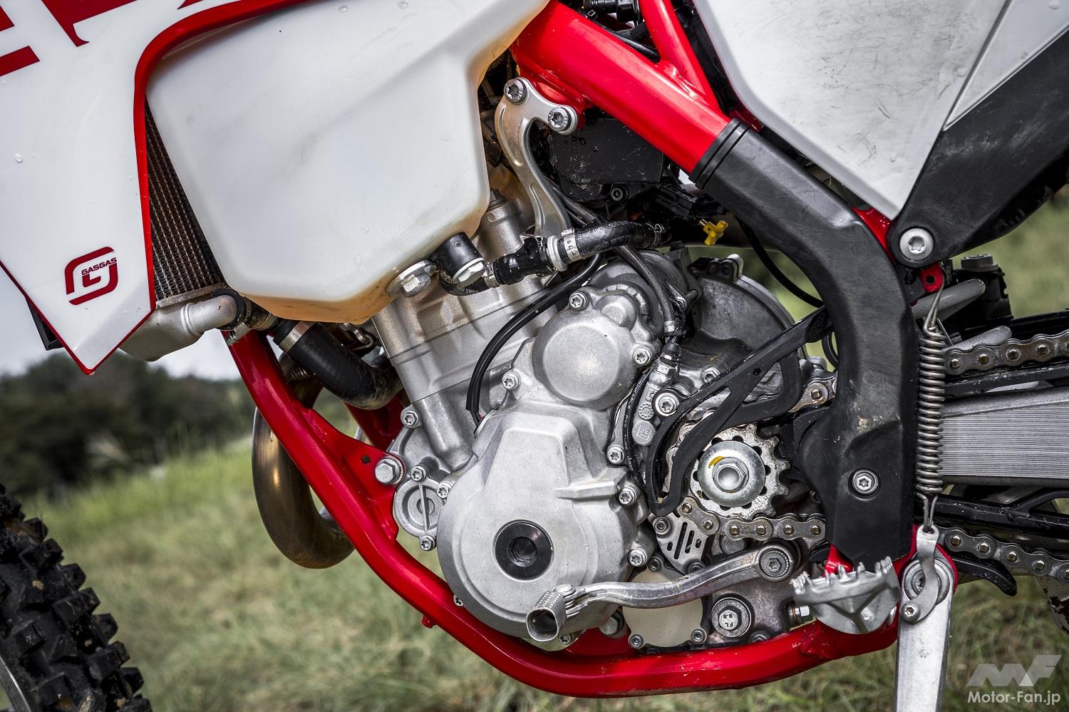 エンジン始動はセル一発。現在ではオフロードマシンもセルが当たり前になって来ているので、これはどんなライダーにも非常に有難い。ややこしい場所でエンストし、キックに苦労した事のあるライダーには、この楽さは体力温存などとにかく嬉しい。セルやバッテリー搭載の重量増加は僅かなもので、走破性への影響はほぼ無いに等しいので尚更だ。