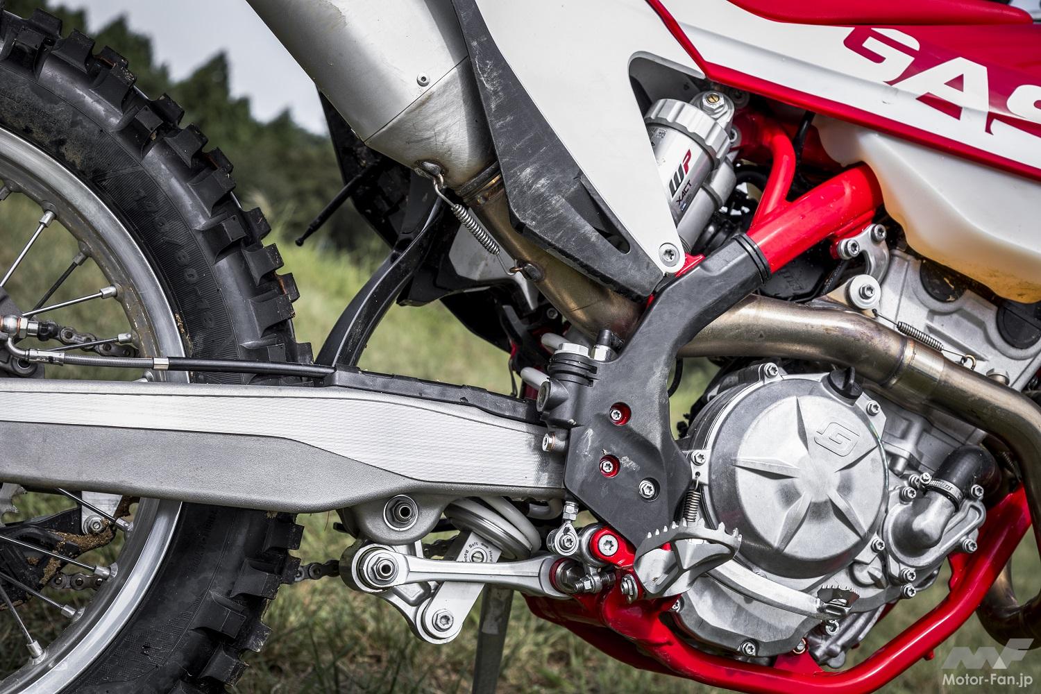 フロントフォークはWP製の倒立でφ48m。リヤもWP製のリンク式。車重は半乾燥で105.6kg(装備で110kgちょっとくらいか)となっている。国産市販車が134~150kgくらいなので、非常に軽量なものとなっている。