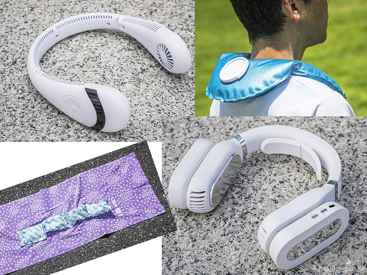首の左右部に設置された金属部が冷えるシステムのネッククーラー。灼熱の中、3段階調整システムでもっとも冷える15℃に設定し、首に掛けてみたところ、確かに最初は冷たさが感じられる。