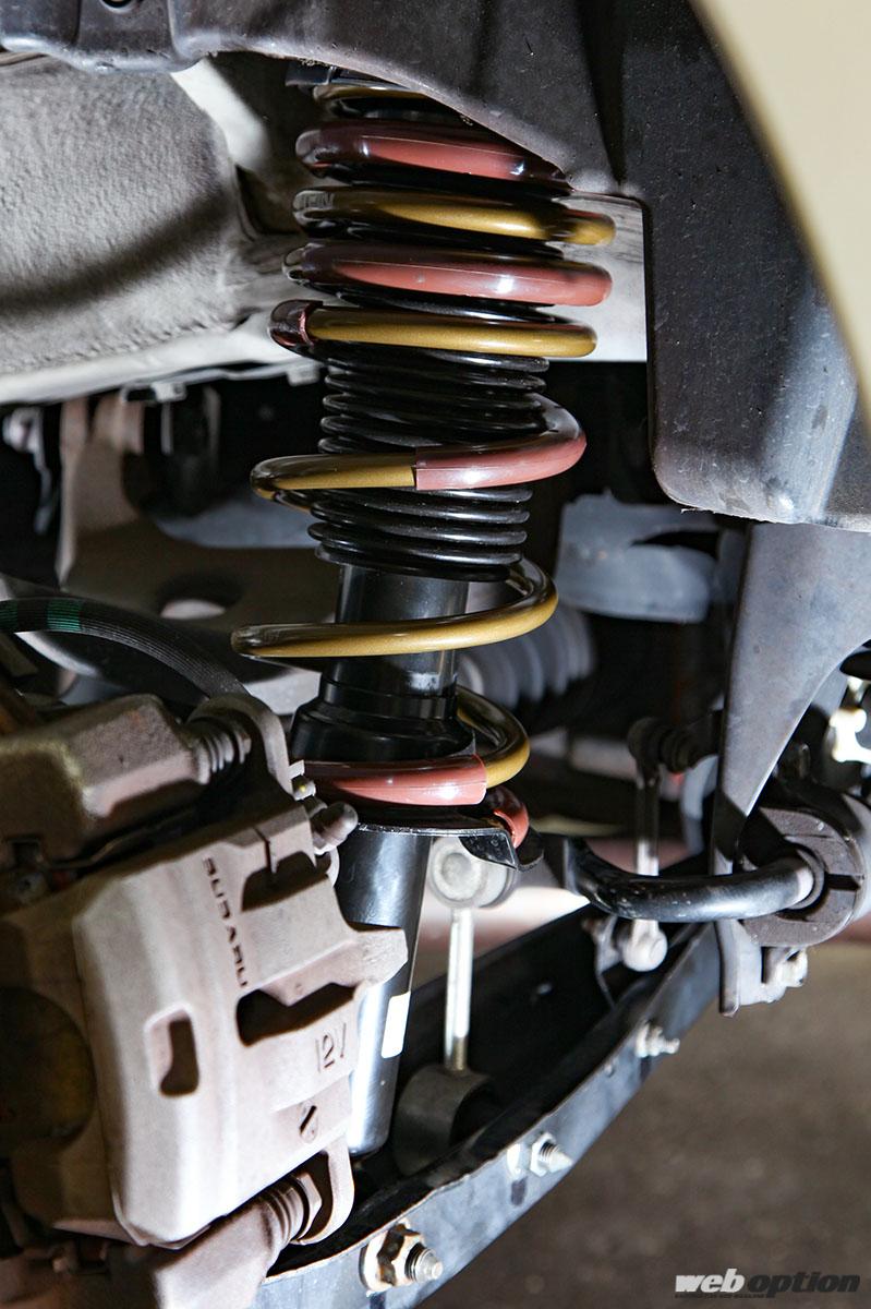 組み合わせるスプリングは、これまた熊倉さんが試してみたかったことと購入しやすい実勢価格からテインハイテクのZN8用を選択。装着後、軽く馴染ませて計測したところ、車高はノーマル比フロント15mm、リヤ20mmダウンとなった。ちなみに、純正ダンパーはともにショウワ製。スプリングレートはZN6純正を基準に考えると、ZN8純正が約17%、ZN8用テインハイテクは約48%アップとなる。