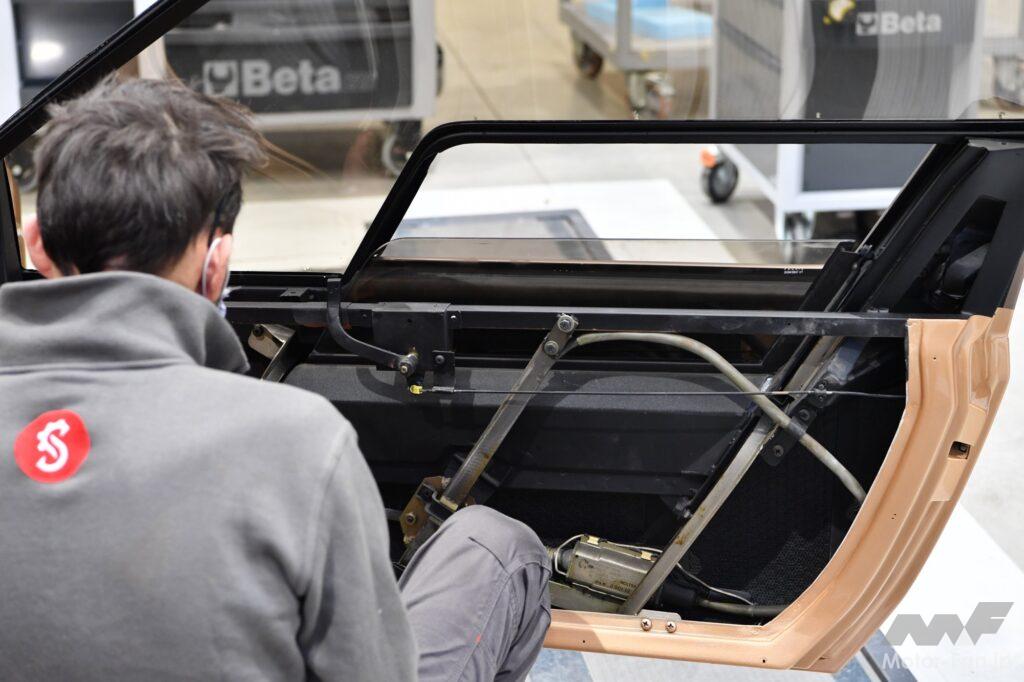 シートなどのファブリックの汚れやカビを蒸気で除去し、ひどく傷んだ部分の革は新たに作り直した。ドアトリムも基本的はクリーニングだけだったようだ。ドア内部のパワーウインドウの機構は整備を要したことが写真からうかがえる。