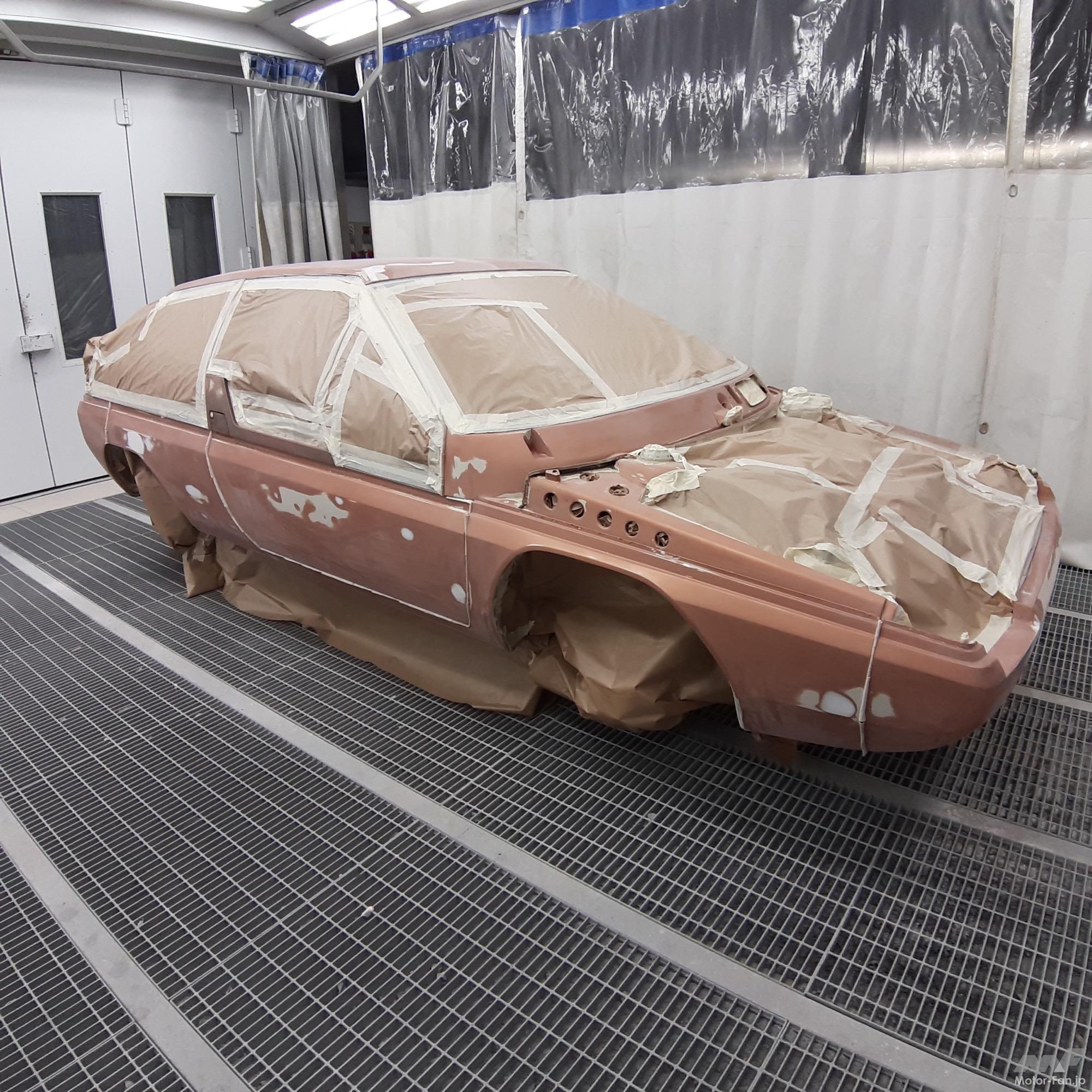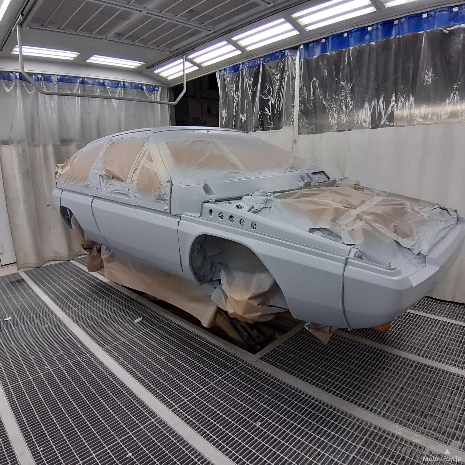 デジタルスキャニングでオリジナルのボディカラーを特定した上で、塗装をすべて剥いで板金の状態にしてから液状ポリパテをスプレーし、微妙な面の凹凸をポリパテで修正。そこにサフェーサーをスプレーし、サンディングしてから塗装。リトラクタブルヘッドランプは広島で作動確認していたが、その筐体はボディと同様に処理して再塗装した。