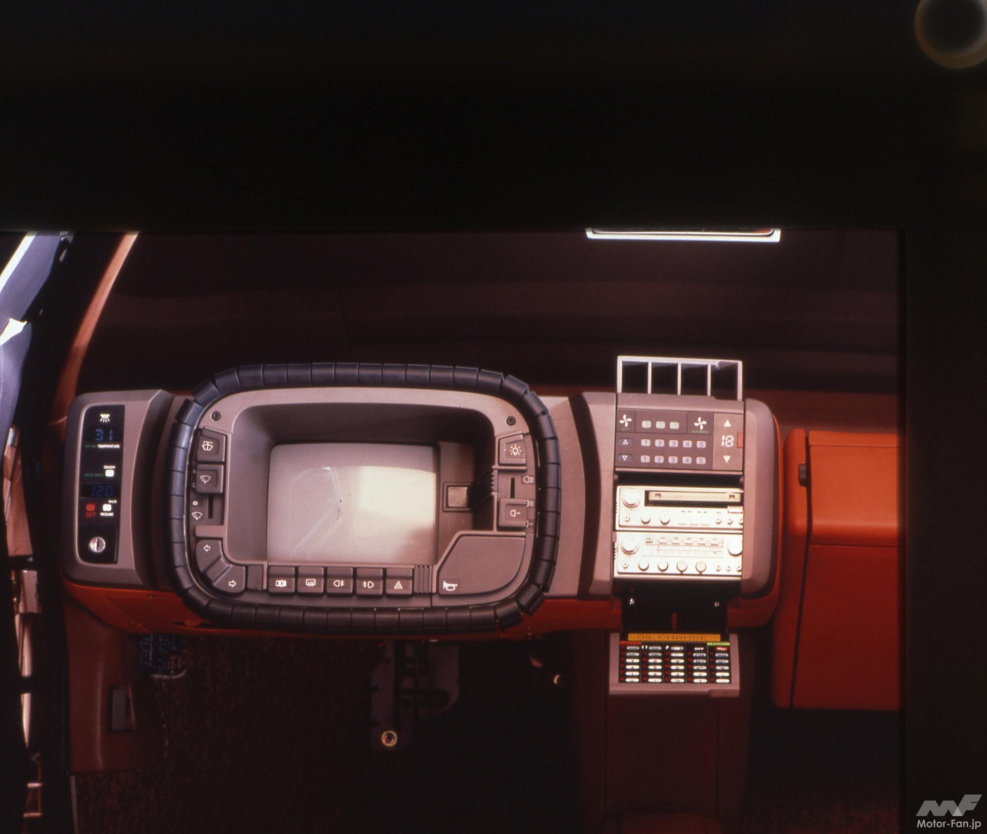 インテリアの最大の特徴は、前編でも触れたように、CRT(ブラウン管)のメーターとそれを取り巻くキャタピラ状のステアリング。80年代に始まったデジタルメーターのトレンドを先取りしつつ、さらなる先進性を小さなコマを並べたステアリングで表現したのだ。