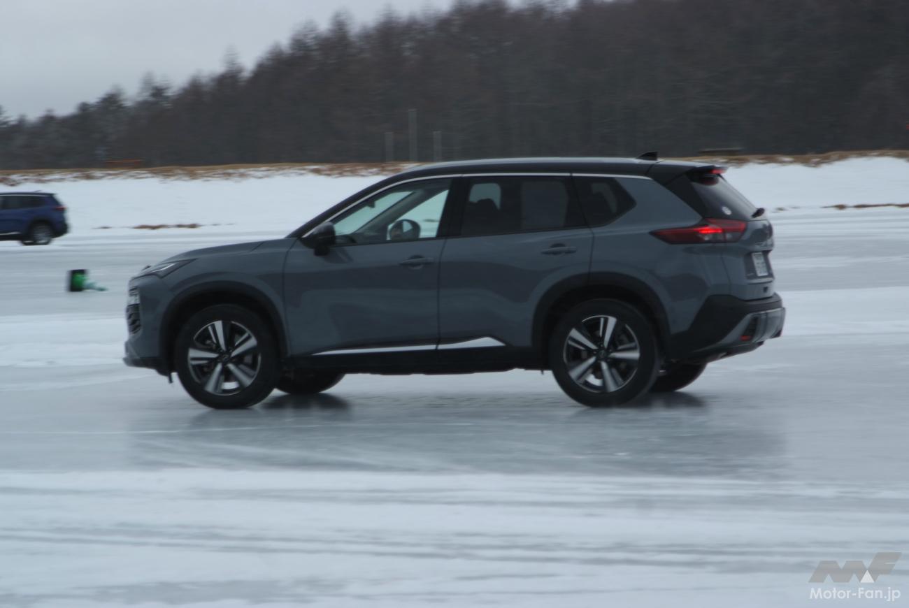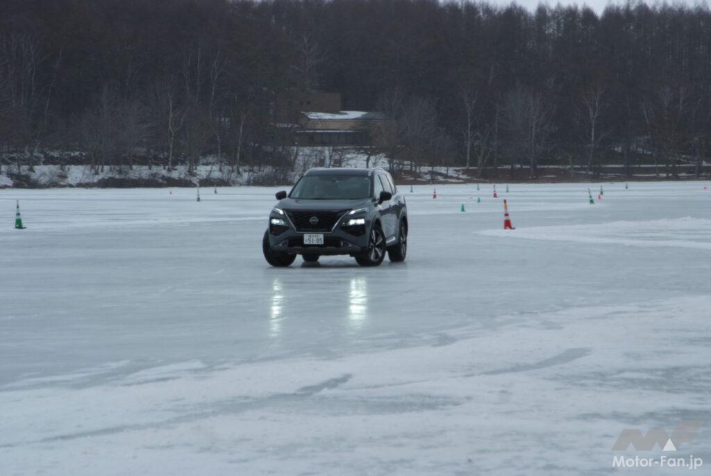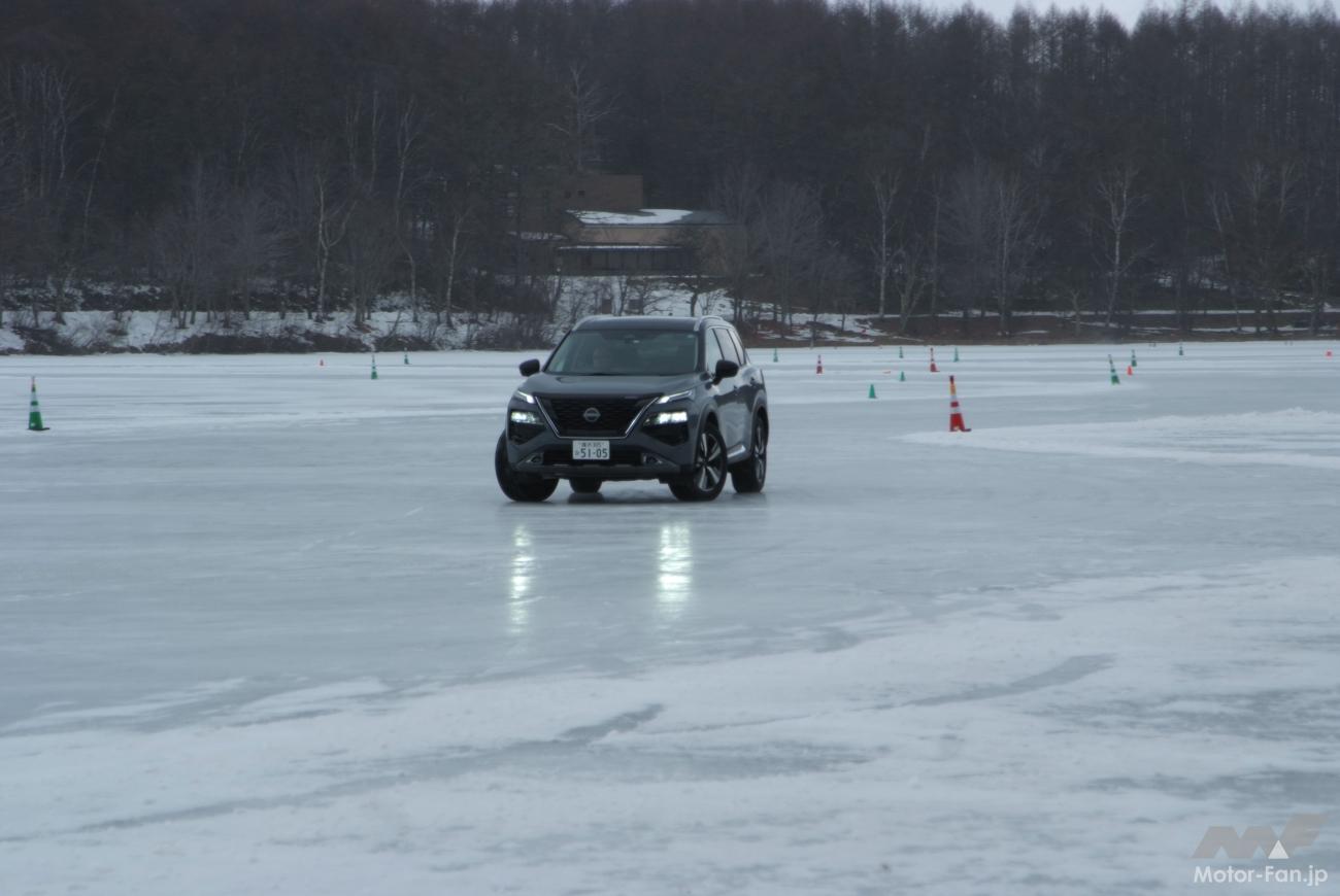 その実力を女神湖(長野県北佐久郡立科町)で開催された氷上試乗会で確かめる! 試乗会では日産のそのほかの4WD車なども用意され、同時に試乗することができた。システムや車種の違いによる凍結路面での走り、e-4ORCE以外の4WDの実力も確かめることができた。