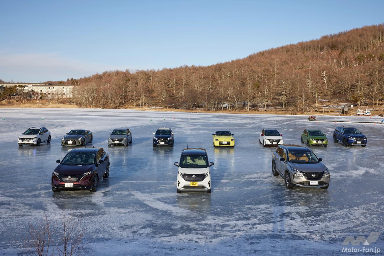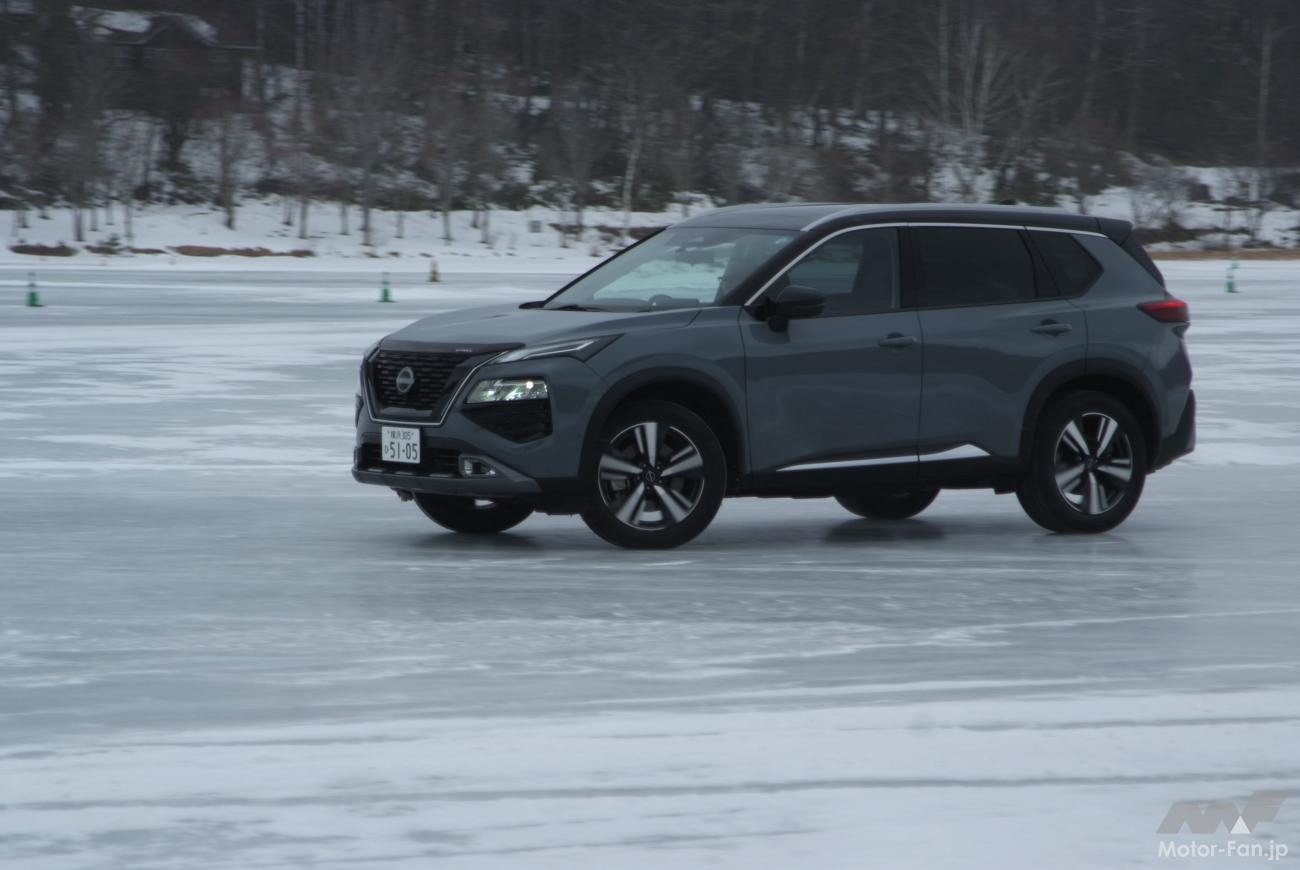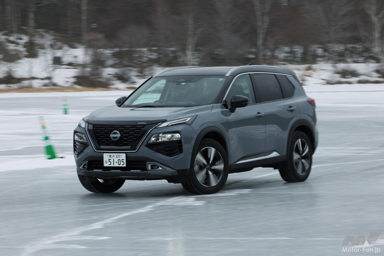 その実力を女神湖(長野県北佐久郡立科町)で開催された氷上試乗会で確かめる! 試乗会では日産のそのほかの4WD車なども用意され、同時に試乗することができた。システムや車種の違いによる凍結路面での走り、e-4ORCE以外の4WDの実力も確かめることができた。