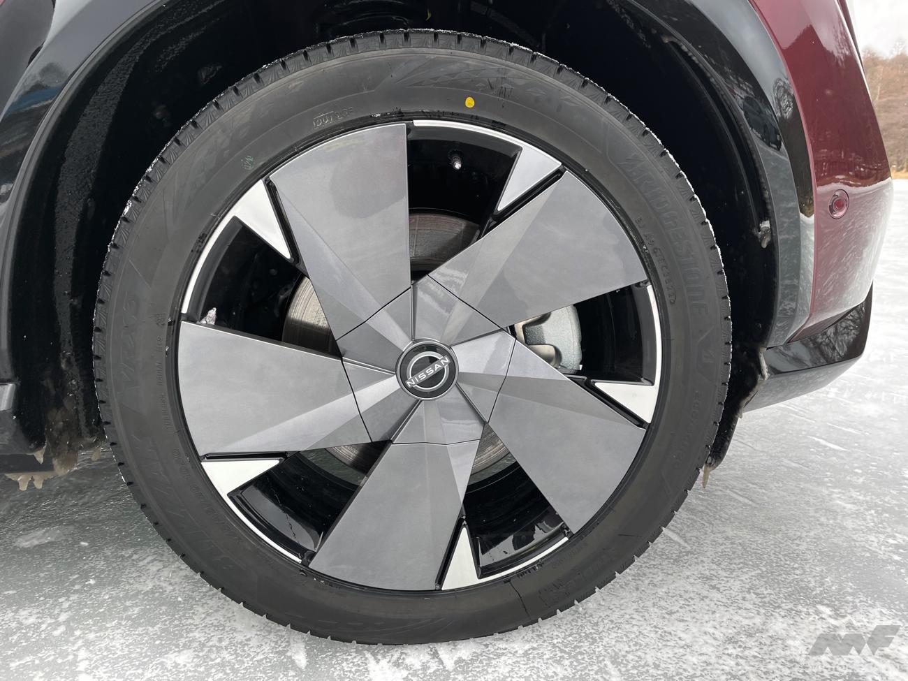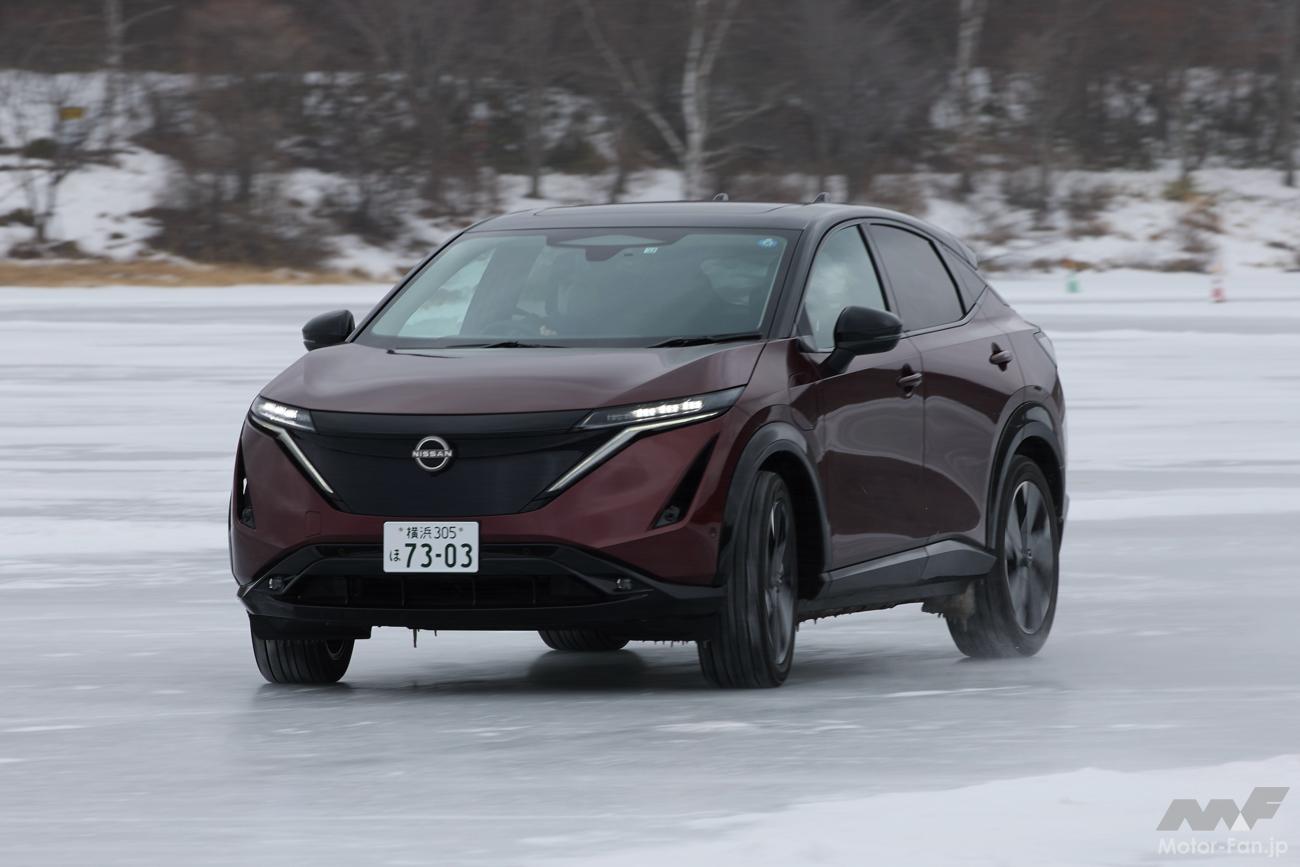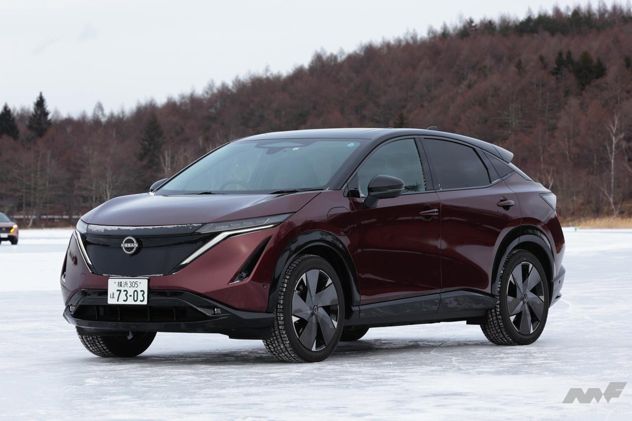 2022年6月にデビューしたアリアの4WDモデル。前後にそれぞれ同じ最大出力218psというハイパワーなモーターを搭載し、車重は2.2tというヘビー級。とても氷上で扱いきれる気がしない数値だが、走らせてみるとそれは杞憂に過ぎなかった。