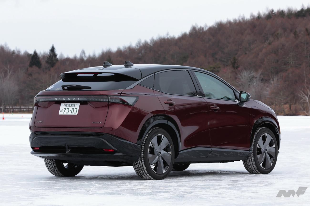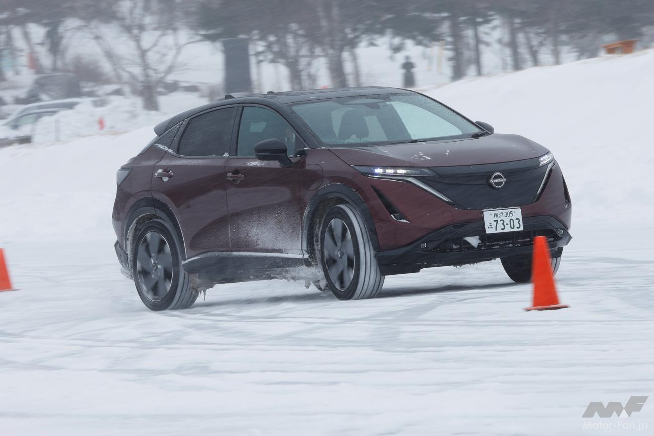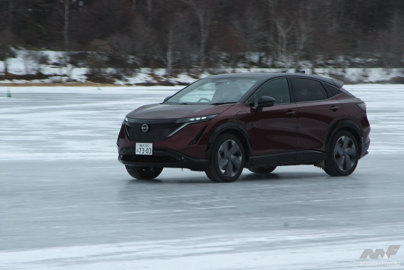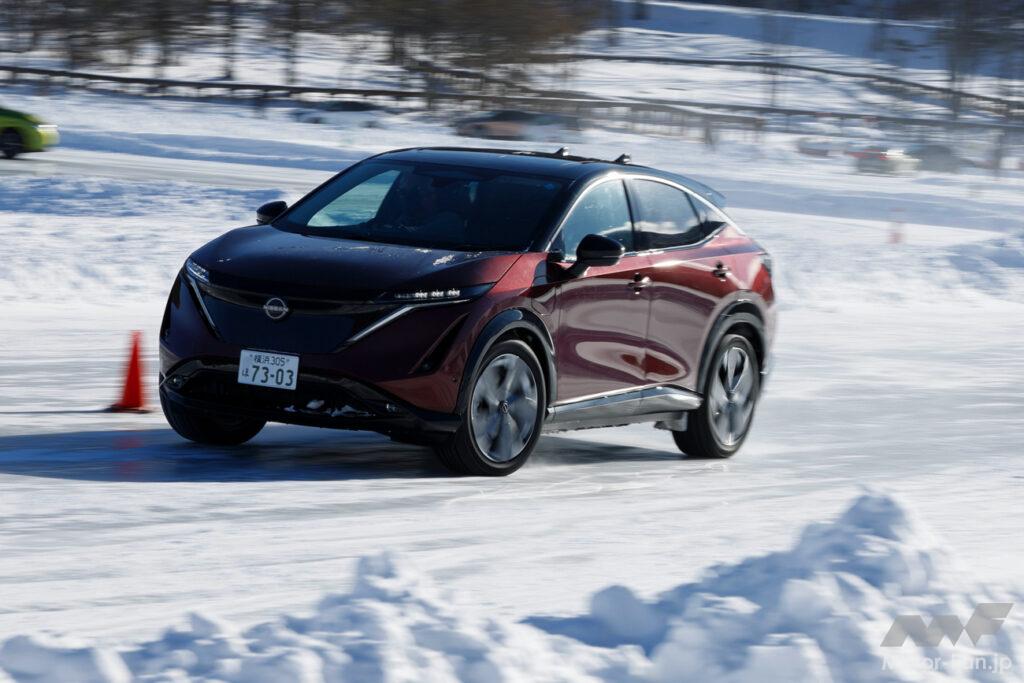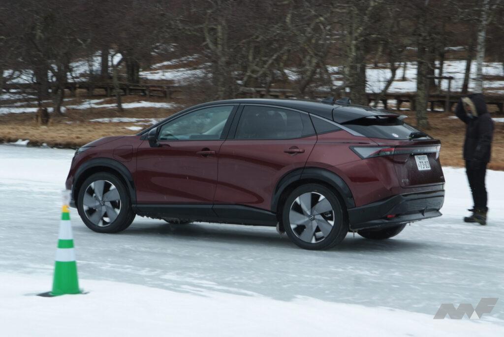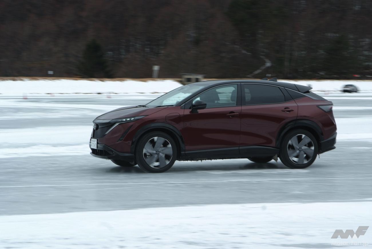 かといって、それがアリアに対して劣っているのかといえばそういうわけではなく、氷雪路においても申し分なく加減速し、適切な速度域であれば安定感のあるコーナーリングを見せる。定常円でもアクセルコントロールで一定舵角のまま旋回を続けられる。