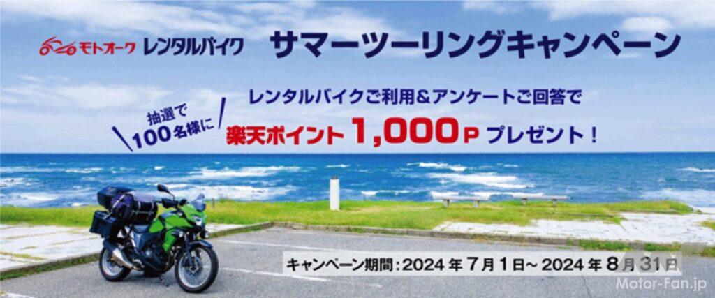 オークネット・モーターサイクルは、展開中の「モトオークレンタルバイク」の利用・アンケートの回答者に楽天ポイント(1,000ポイント)を進呈する。対象者の中から100名の抽選となる。期間は2024年7月1日〜8月31日まで。