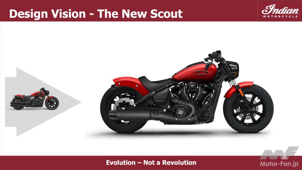 新型スカウトに乗って登場したOLA STENEGARD氏はデザインについて解説。開発で大切にしているのは、なるべくシンプルなデザインをキープする。実はそれが難しい。例えばタンクやフェンダーデザインなどがそれで、そこにはカスタムのしやすさにも配慮しているからだと言う。今回の開発には、ユーザーの声を徹底的に調査してスタート、革新ではなく、進化をもたらすことに注力。全てを一新したがスカウトらしさは大切にした。
